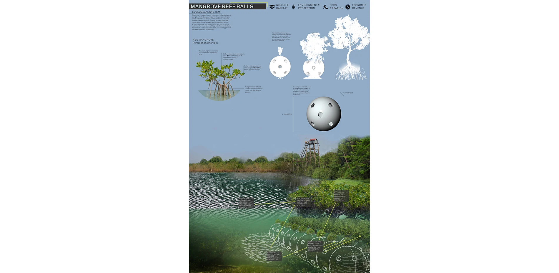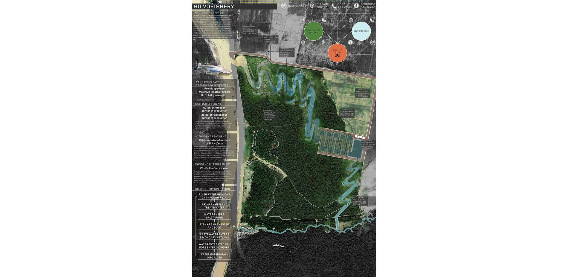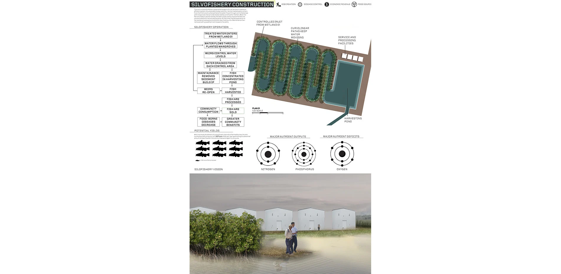 As the largest freshwater lake in Southeast Asia, Tonle Sap, located in the heart of Cambodia, is a highly productive and volatile system. Currently, 1.2 to 1.5 million people move with the lake’s temporal change each year, but live in poor and unhealthy conditions. The goal of the project is aimed at how to interpret the native landscape and nature of the lake while improving the overall quality of life for the communities that call it home. Three main strategies are designed to improve the ecosystem, health, and economy: waterless toilets and an anaerobic digester, fabricated mangrove reef balls, and a constructed wetland and silvofishery. Each implemented system would create a new network that would positively impact the surrounding human and environmental communities. With the success of one primary site, each technology could be adapted and phased into the other major community sites around the Lake’s perimeter and potentially improve the quality of life for over 10% of Cambodia’s population.
