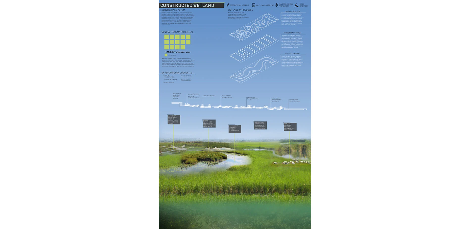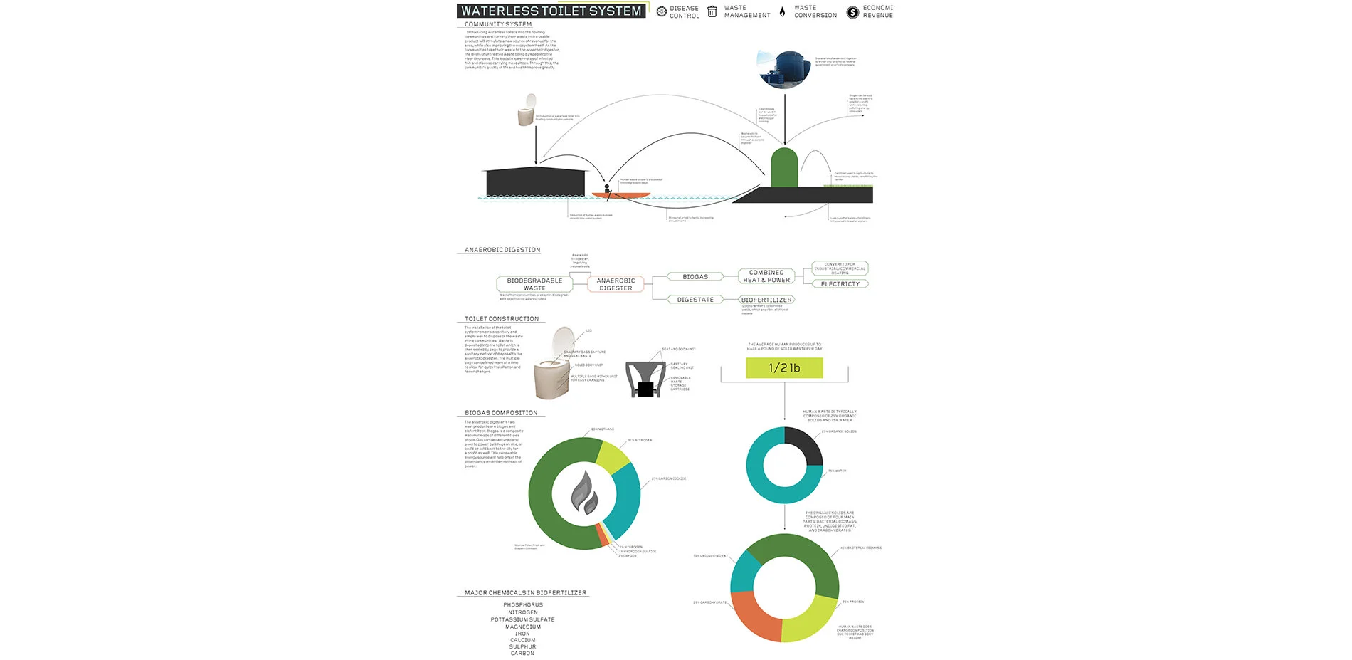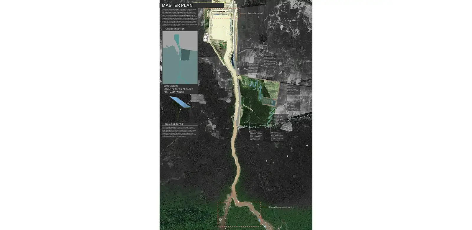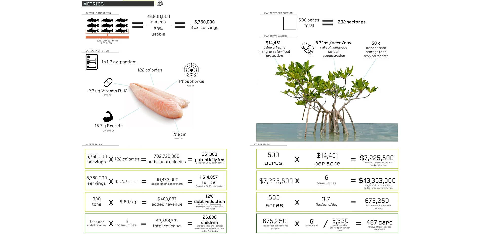 As the largest freshwater lake in Southeast Asia, Tonle Sap, located in the heart of Cambodia, is a highly productive and volatile system. Currently, 1.2 to 1.5 million people move with the lake’s temporal change each year, but live in poor and unhealthy conditions. The goal of the project is aimed at how to interpret the native landscape and nature of the lake while improving the overall quality of life for the communities that call it home. Three main strategies are designed to improve the ecosystem, health, and economy: waterless toilets and an anaerobic digester, fabricated mangrove reef balls, and a constructed wetland and silvofishery. Each implemented system would create a new network that would positively impact the surrounding human and environmental communities. With the success of one primary site, each technology could be adapted and phased into the other major community sites around the Lake’s perimeter and potentially improve the quality of life for over 10% of Cambodia’s population.