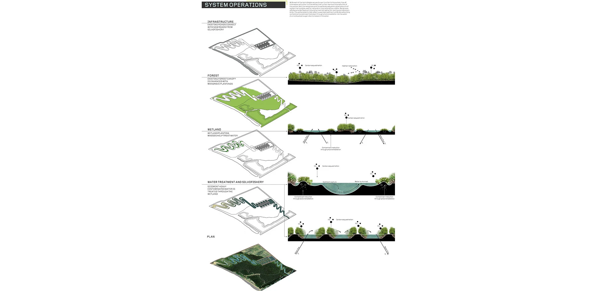 In order to improve the food quality and, in turn, the overall health of the community the existing water must be cleaned and treated so that it could then be used for aquacultural purposes. Water that flows from the ferry terminal into the lake is heavily turbid. Constructing a wetland that utilizes native wetland plants and mangroves would settle the suspended sediment while also capturing and breaking down contaminants through phytoremediation. As the water moves throughout the wetland, it is churned which increased the dissolved oxygen levels necessary to farm catfish. When the treated water enters the silvofishery, it flows through narrow channels that are planted with mangroves on either side. These mangroves would provide shade for the catfish, algae and leaf litter for a natural food source, and roots for habitat and spawning areas. When the farmers choose to harvest the catfish, they would be able to shut each channel off through a weir system that would gradually bring the fish into the harvesting pond. Then, either through net catching or industrial methods, the concentrated fish could be harvested and sent off to markets to be sold. This clean food source would supplement the existing diet with a new source of healthier fish protein which would provide a new and renewable calorie and protein source. The water used by the catfish would then travel through a secondary constructed wetland that would then begin to treat and clean the water again before it reenters the water system.