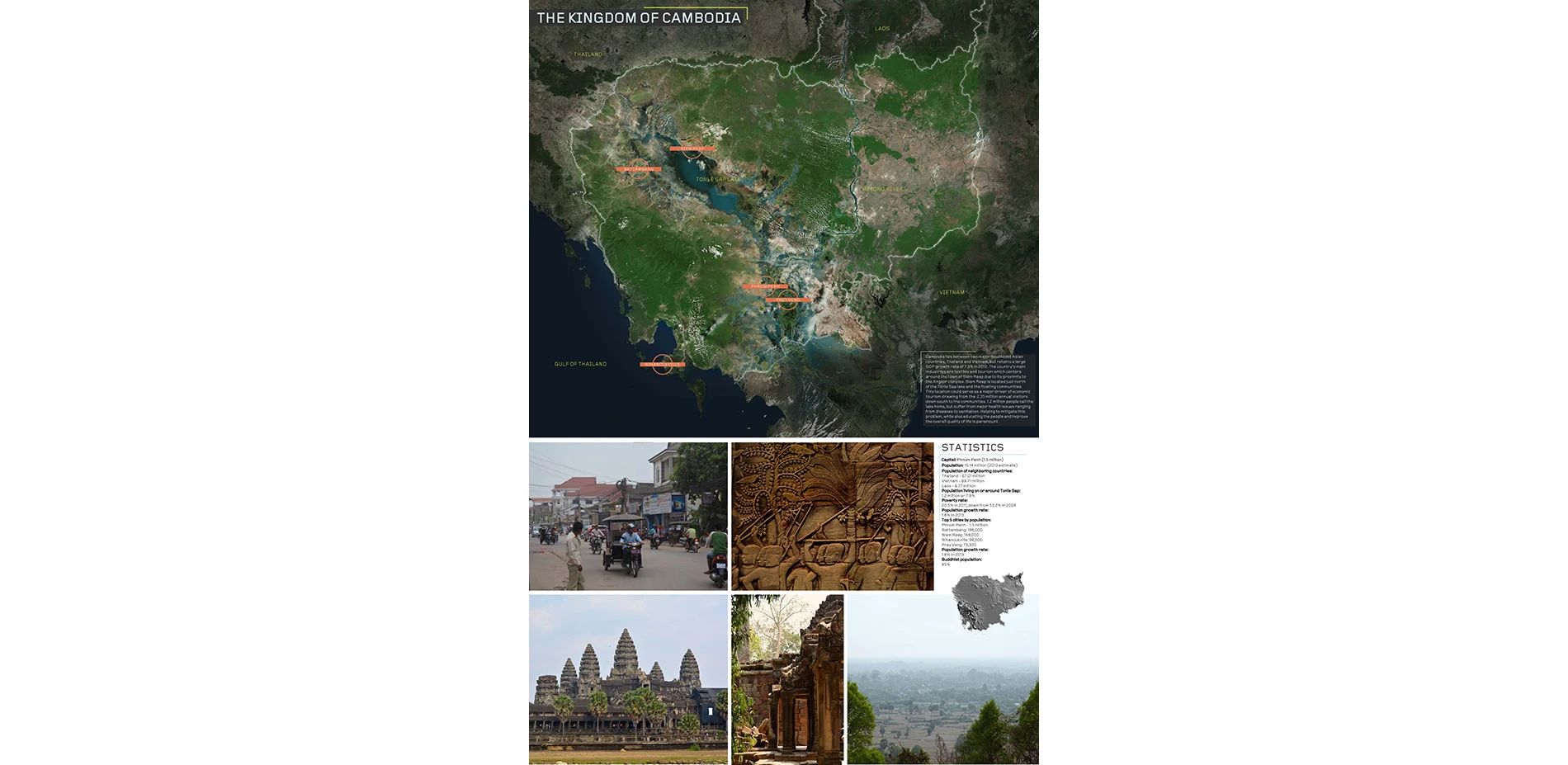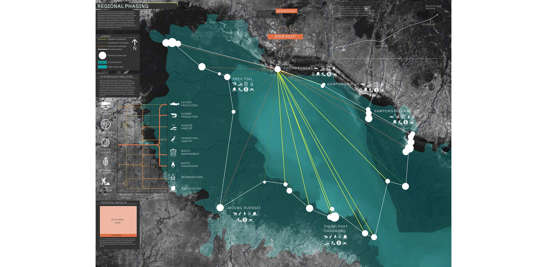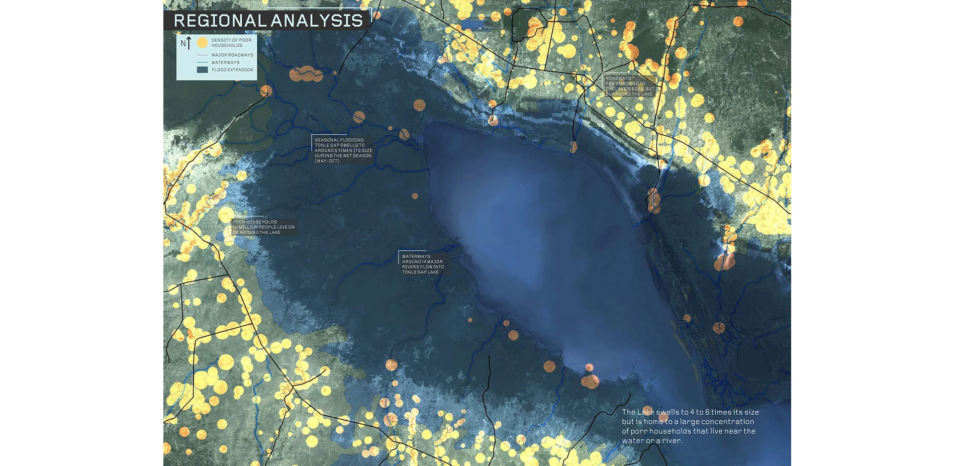Within the Kingdom of Cambodia is the largest freshwater lake in Southeast Asia, Tonle Sap. Imagery of the lake and its usage dates back to the Khmer Empire over 1200 years ago, and the Lake is still heavily used today. Currently, 1.2 to 1.5 million people live on or around the lake which accounts for just over 10% of the Kingdom’s total population. The lake can swell four to six times its size during the wet season which creates a fluctuating and volatile ecological system that is also an integral part to the country’s economy. The project aimed to examine how landscape architects could interpret and analyze a major regional system and implement certain strategies that would improve both the regional ecosystem, quality of life for the communities, and maintain the existing cultural integrity of the area.