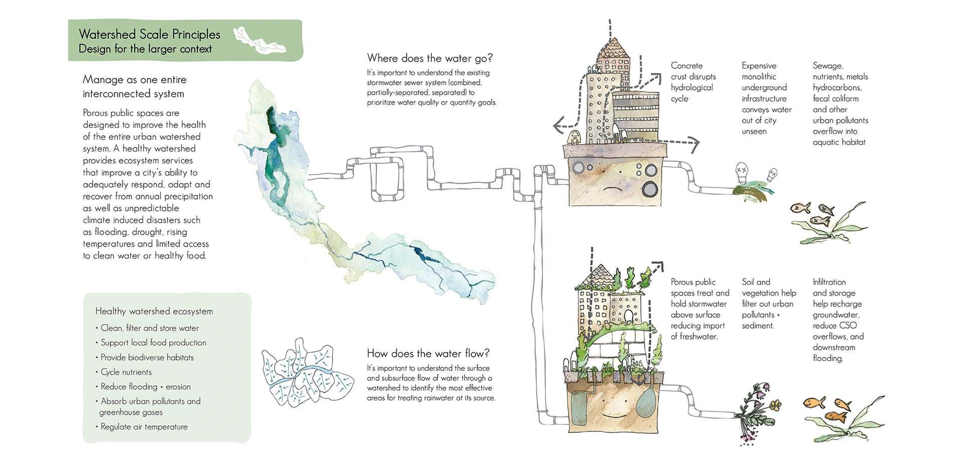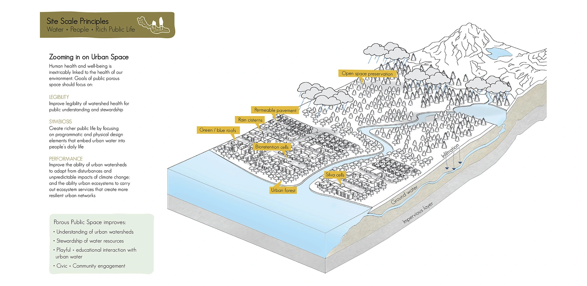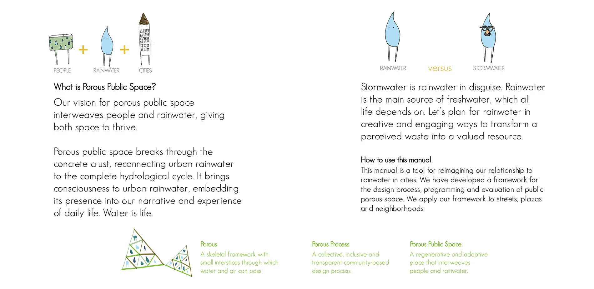 Our porous public space booklet takes the reader on a whimsical journey, playfully intertwining people and rainwater in our cities. It is a tool to deconstruct the concepts and terminology of green stormwater infrastructure because, although the term is widely understood in built environment fields, to the layperson the phrase can often be meaningless. We break the concept down to the basics of designing our built environment to improve both human and watershed health, framing the environmental problem of stormwater as an opportunity to design good public places using rainwater in our streets, plazas and neighborhoods. Presenting a framework that structures a porous community-based design process, we outline seven Porous Public Space principles to create an inspirational and actionable toolkit for communities, designers and local officials to collaboratively design solutions for improved urban watershed health. The booklet is an inspirational tool to bring consciousness to urban rainwater, embedding its presence into our narrative and experience of everyday life.