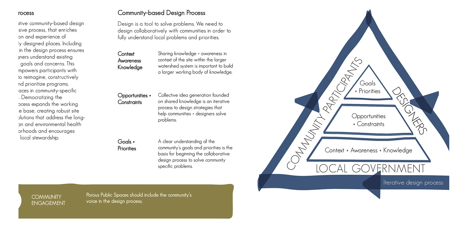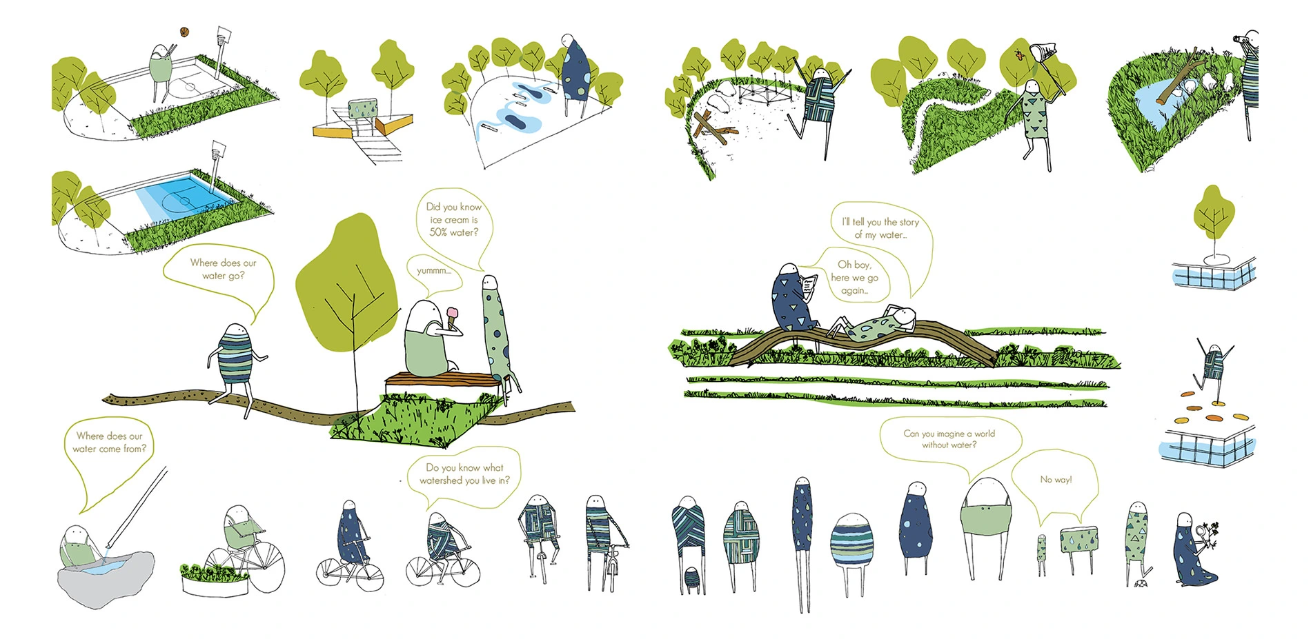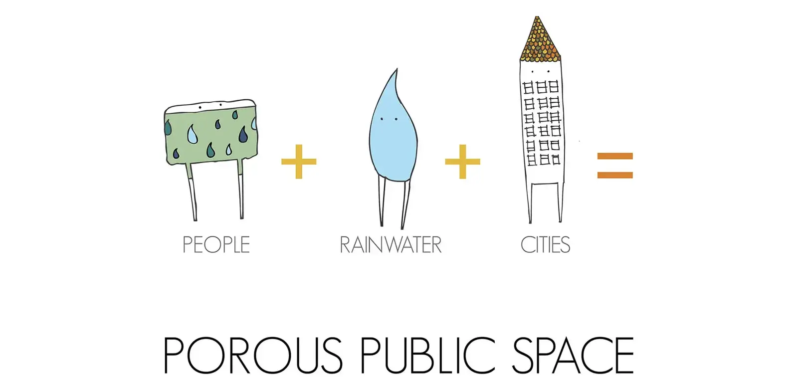 Our porous public space booklet takes the reader on a whimsical journey, playfully intertwining people and rainwater in our cities. It is a tool to deconstruct the concepts and terminology of green stormwater infrastructure because, although the term is widely understood in built environment fields, to the layperson the phrase can often be meaningless. We break the concept down to the basics of designing our built environment to improve both human and watershed health, framing the environmental problem of stormwater as an opportunity to design good public places using rainwater in our streets, plazas and neighborhoods. Presenting a framework that structures a porous community-based design process, we outline seven Porous Public Space principles to create an inspirational and actionable toolkit for communities, designers and local officials to collaboratively design solutions for improved urban watershed health. The booklet is an inspirational tool to bring consciousness to urban rainwater, embedding its presence into our narrative and experience of everyday life.