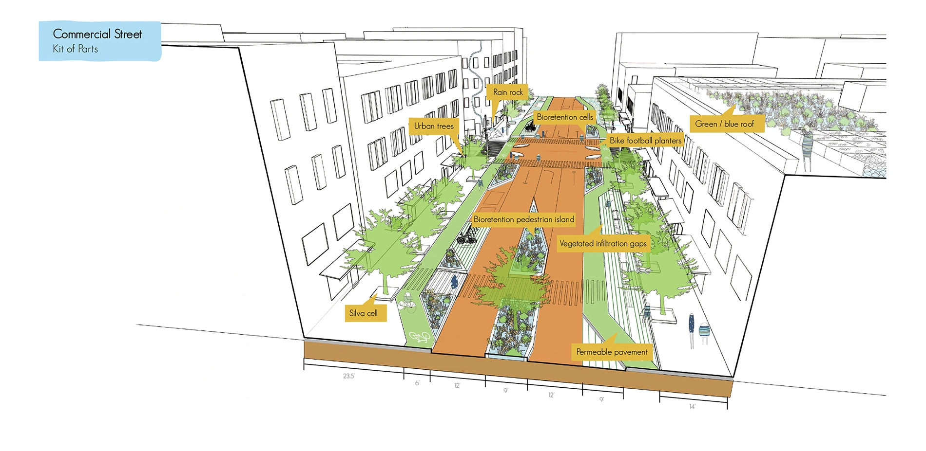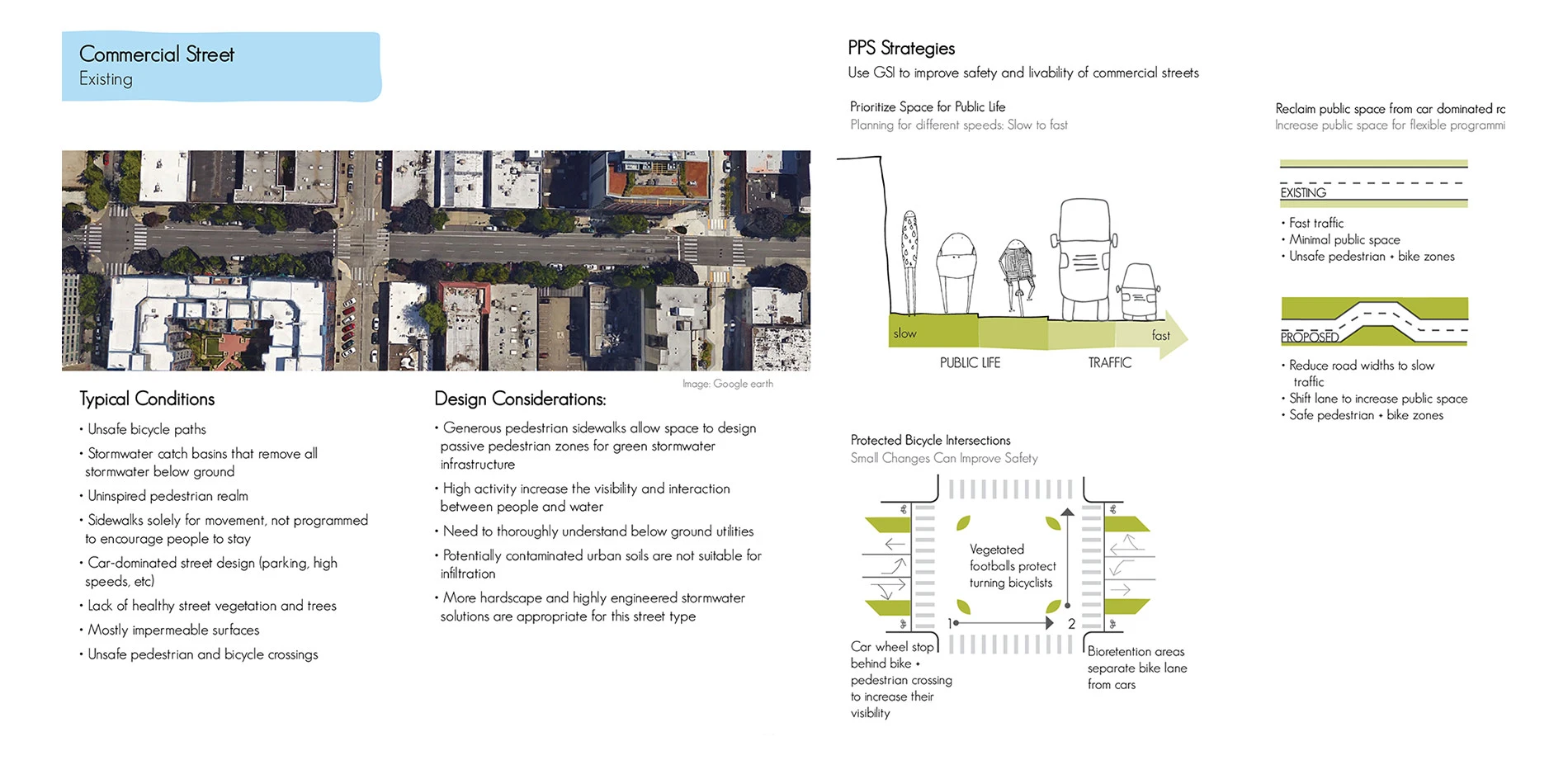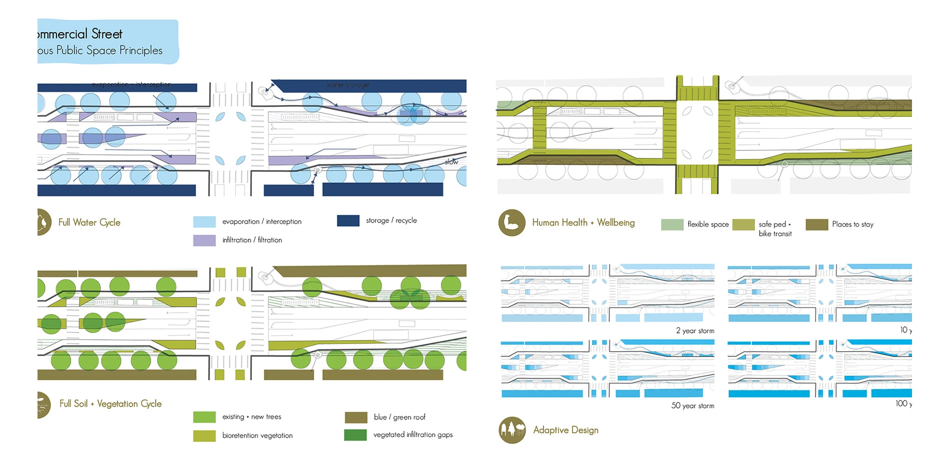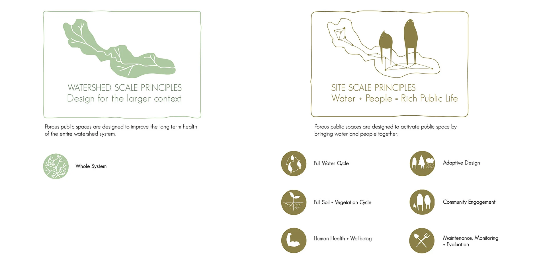 Our Porous Public Space booklet is a response to the built environment’s detrimental impacts to our cultural and ecological systems. We use the term porosity in a dual sense: to characterize changes to the physical built environment as well as building social infrastructure through an inclusive community-based design process. We reframe the conventional wastewater treatment of urban rainwater instead as an opportunity to keep rainwater above ground for community delight, store it for reuse, clean it for healthy aquatic habitat and infiltrate it for groundwater recharge. Porous Public Spaces intertwine ecological design with urban design. We use strategies from both design frameworks to bring people and rainwater together in cities, to create vibrant public life. Porous Public Spaces build social connectedness around water, stewardship of local water resources, understanding about the hydrological cycle’s interaction with the watershed and the city’s context within the larger watershed. We define seven watershed and site-scaled principles that double as a guide for the design process and as a checklist to evaluate existing public places. We apply our principles for design and evaluation to streets, plazas and neighborhoods by redesigning common street typologies and evaluating exemplary sites through case studies. In the booklet, our two and three-dimensional diagrams illustrate how commercial, residential, and mixed-use streets can be reconfigured into Porous Public Spaces through application of our Full Water Cycle, Human Health + Well-being, Full Soil + Vegetation Cycle, and Adaptive Design principles. Through both the community-based design process and experience of place, the booklet focuses on interweaving urban rainwater into the network of our built environment and collective consciousness to simultaneously improve both human and watershed health.