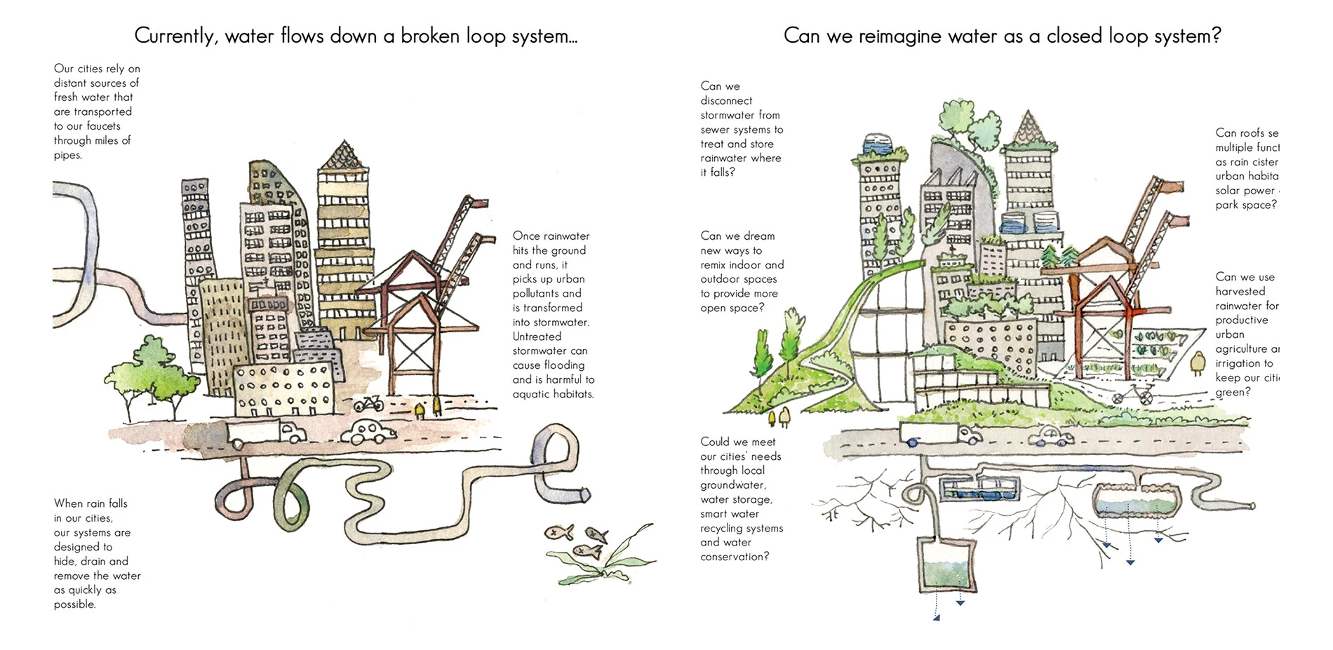 Our Porous Public Space booklet is an inspirational tool for reimagining our relationship to rainwater in our cities. Rainwater is the main source of freshwater in the world, yet urban rainwater, or stormwater, is often perceived as a waste. Currently, urban rainwater is made invisible through underground infrastructure designed to hide, concentrate and remove it rapidly. Culturally, the visual erasure of urban rainwater from our built environment removes it from our consciousness, severing our experiential memory and emotional connection to urban rainwater. Ecologically, this framework for managing urban rainwater disrupts the hydrological cycle’s ability to clean, filter, store and infiltrate rainwater, creating environmental impacts to surface waters, aquatic life, groundwater resources and human health. The resulting degradation to the watershed diminishes a region’s ability to respond, adapt and recover from unpredictable climate change induced disasters such as flooding, drought, rising temperatures and access to clean water or fresh foods.