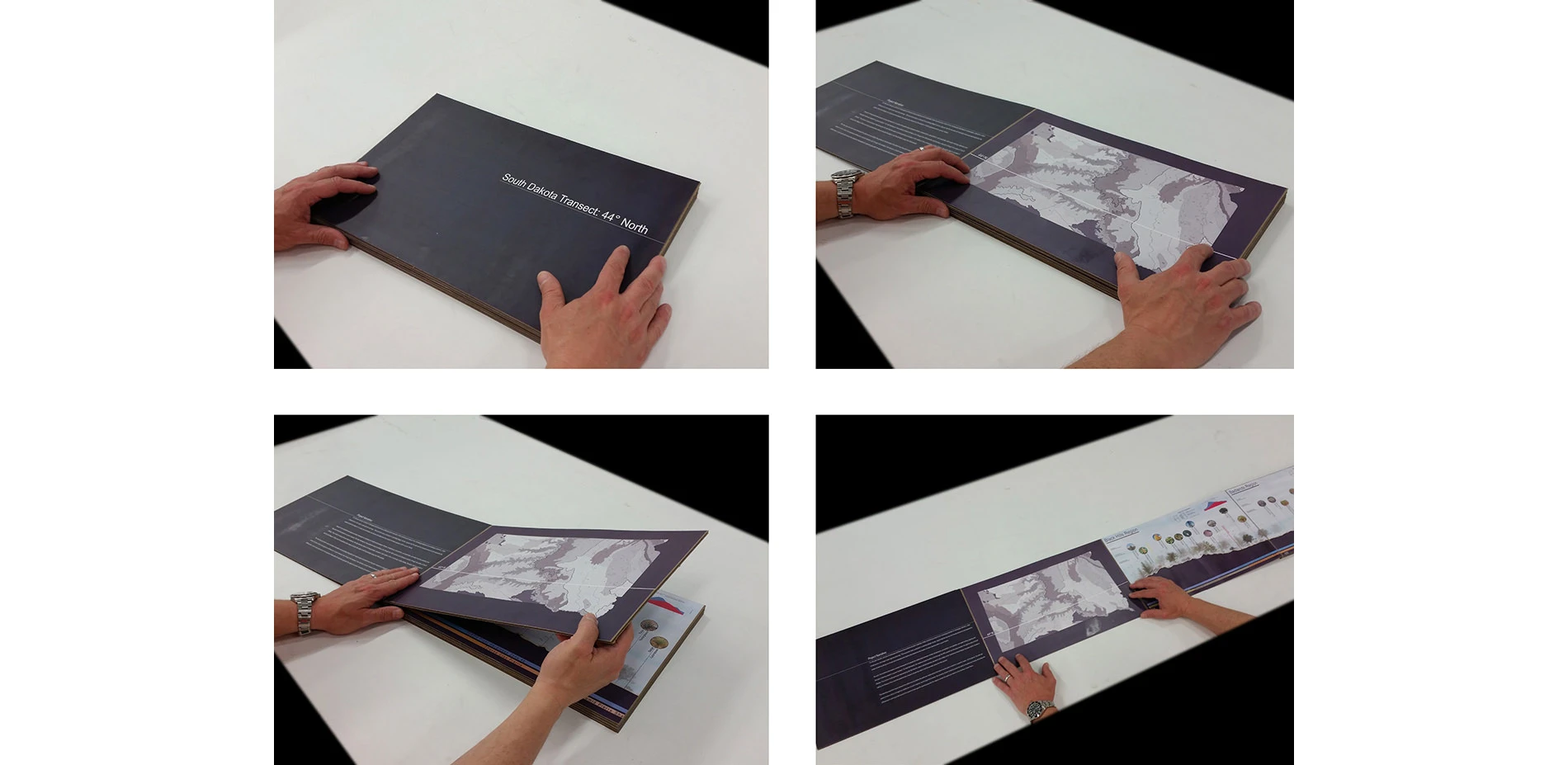 South Dakota Transect is an accordion book that transects the state of South Dakota in half from West to East along the 44th parallel and looks at the plant material along that parallel through its association and dependence on climate, temperature, precipitation, soil substrate, top soil, organic matter, water holding capacity and other cultural requirements. The state of South Dakota, located in the Northern Great Plains, is divided in half by the Missouri River. At first glance, the state appears to have a fairly homogenous distribution of plant material, but through this transect, the diversity of plant material across the state is revealed and clearly articulates the differences in plant populations and the reasons those specific species populate the regions across this particular stretch of the Northern Great Plains.