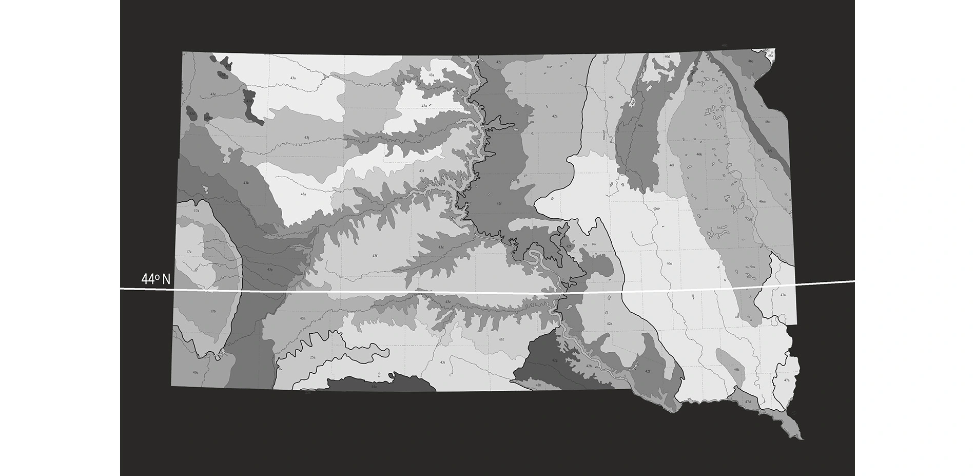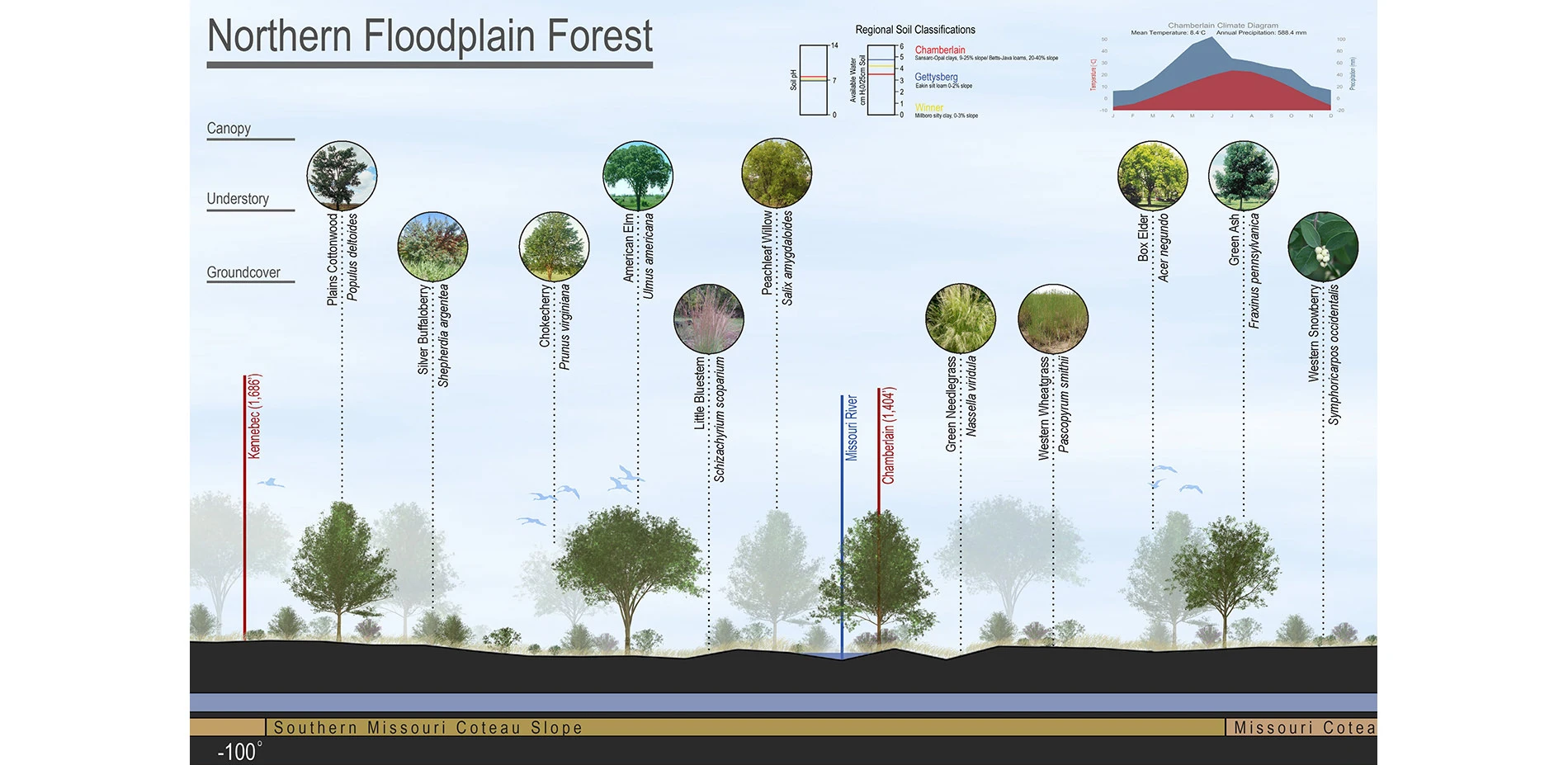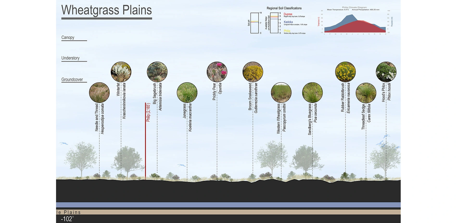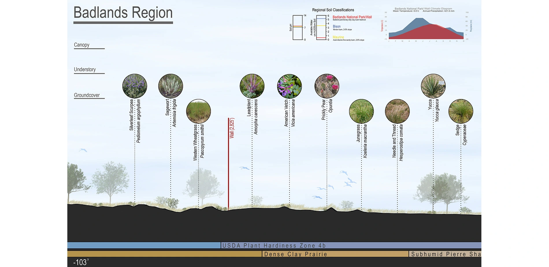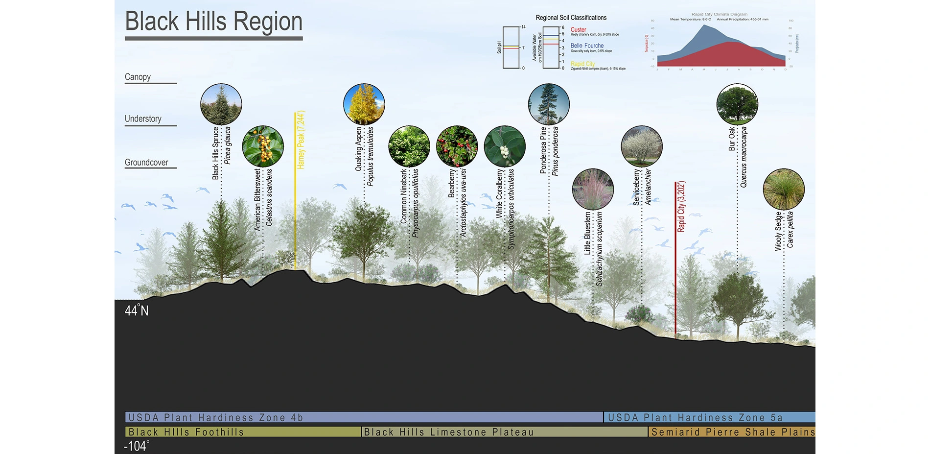 As such, the students developed a simple framework to illustrate the relationship between climate, temperature, precipitation, soil substrate, and water holding capacity and the plant material present in a given location. For that framework, the students chose to strike a line through the 44th parallel and develop a section through the state of South Dakota. This division holds particular resonance by the fact that the state is almost perfectly situated in the middle of the Continental United States, the state itself is divided in half by the Missouri River and the students then chose to divide the state in half horizontally along the 44th parallel.