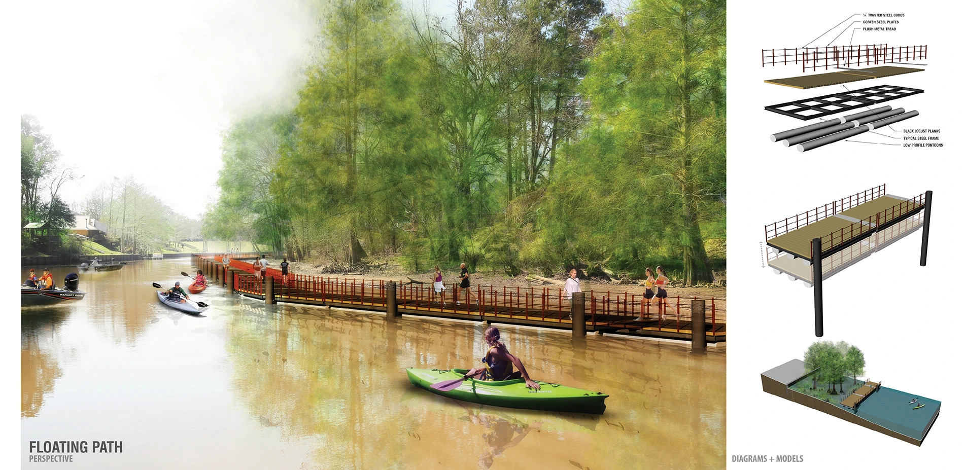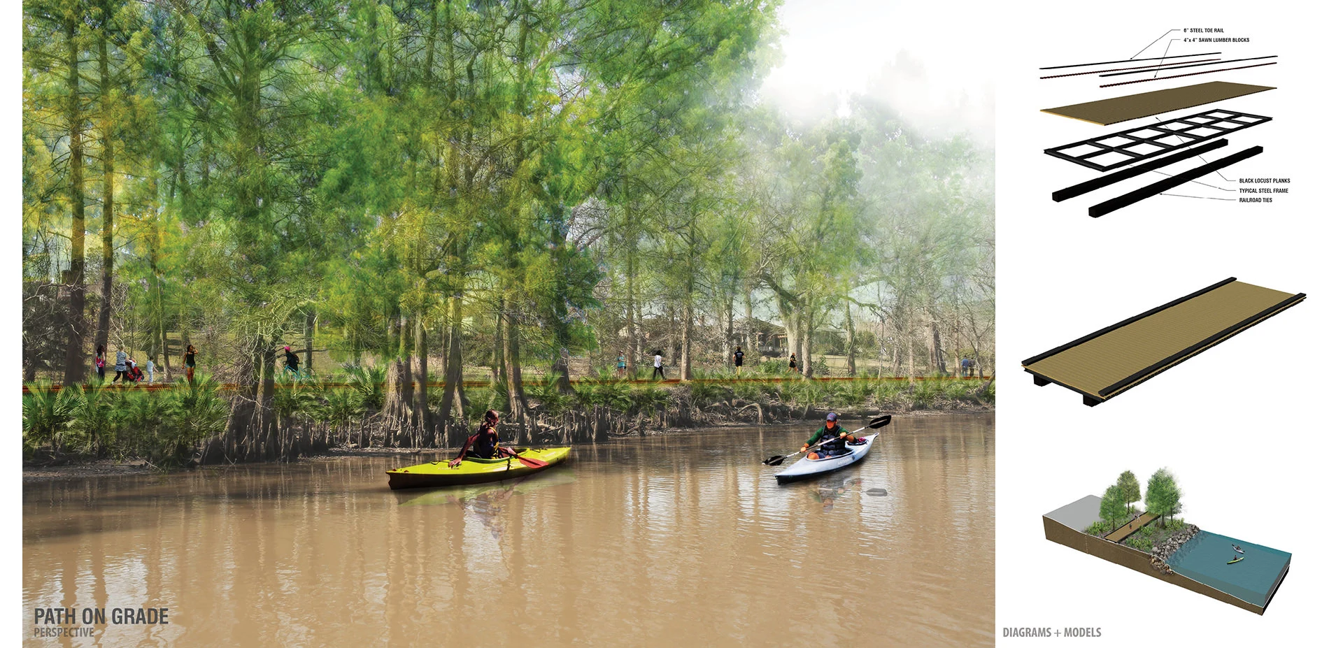 This project, located in Lafayette, Louisiana, aims to establish a connection among open spaces along Bayou Vermilion in order to enhance its use as a cultural, economic, ecological, and open space amenity. Like many other small communities in Louisiana and elsewhere, Lafayette turned its back on the waterway that facilitated the area’s original settlement. Much of the land along the bayou is privately owned and residential, with public access limited to a few critical points; at which, this project proposes a transit hub, a mixed-use center, and connections to existing public recreation and open spaces. To reinforce these new uses, a trail will connect several destinations by utilizing land on the banks of Bayou Vermilion adjacent to existing residential properties. The intent of this project is to create public access to Lafayette’s historic and scenic Bayou Vermilion, thereby enabling local residents access to the Bayou’s unique cultural, ecological, and open space potential. In addition, this project can provide a model for similar waterfront access for other Louisiana communities that share similar conditions.