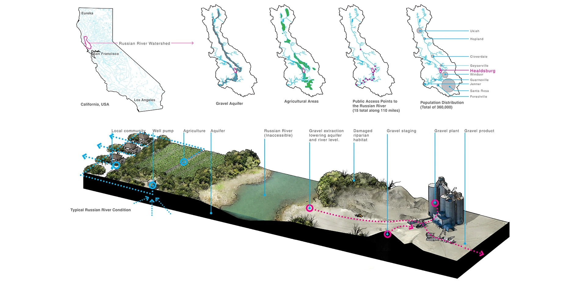 Located fifty miles north of San Francisco, the Russian River watershed is comprised of over 150 creeks and inlets that flow from a spring in Mendocino County to the Pacific Ocean. The Russian River and its aquifer are vital resources for the 360,000 people living in the region and provide the basis for the local ecology, water supply, agriculture and industry. Over the years agricultural and gravel mining industries have monopolized the riverfront resulting in only 15 areas that are publically accessible along the entire length of the river.