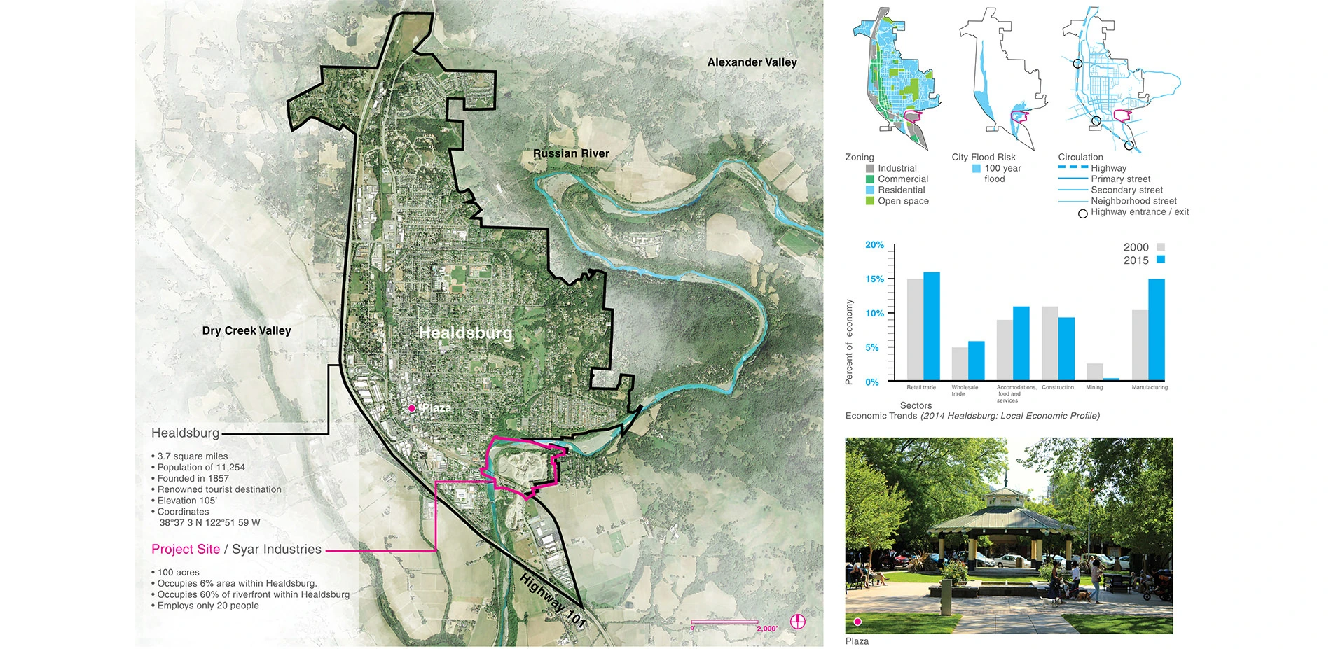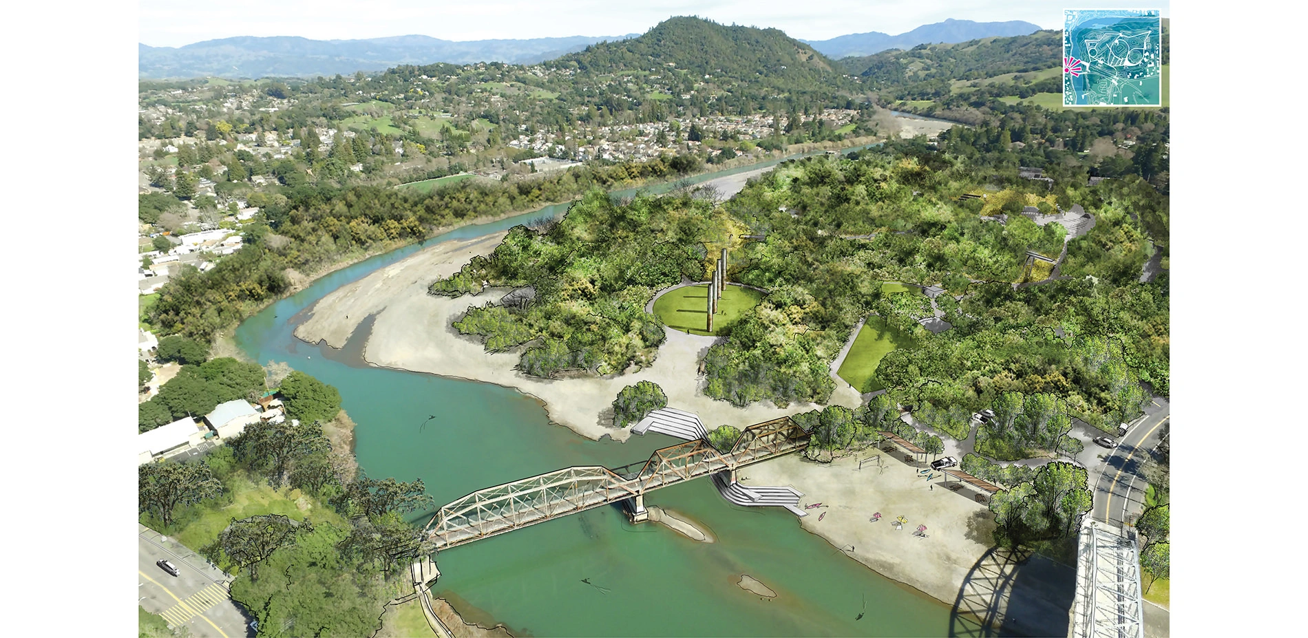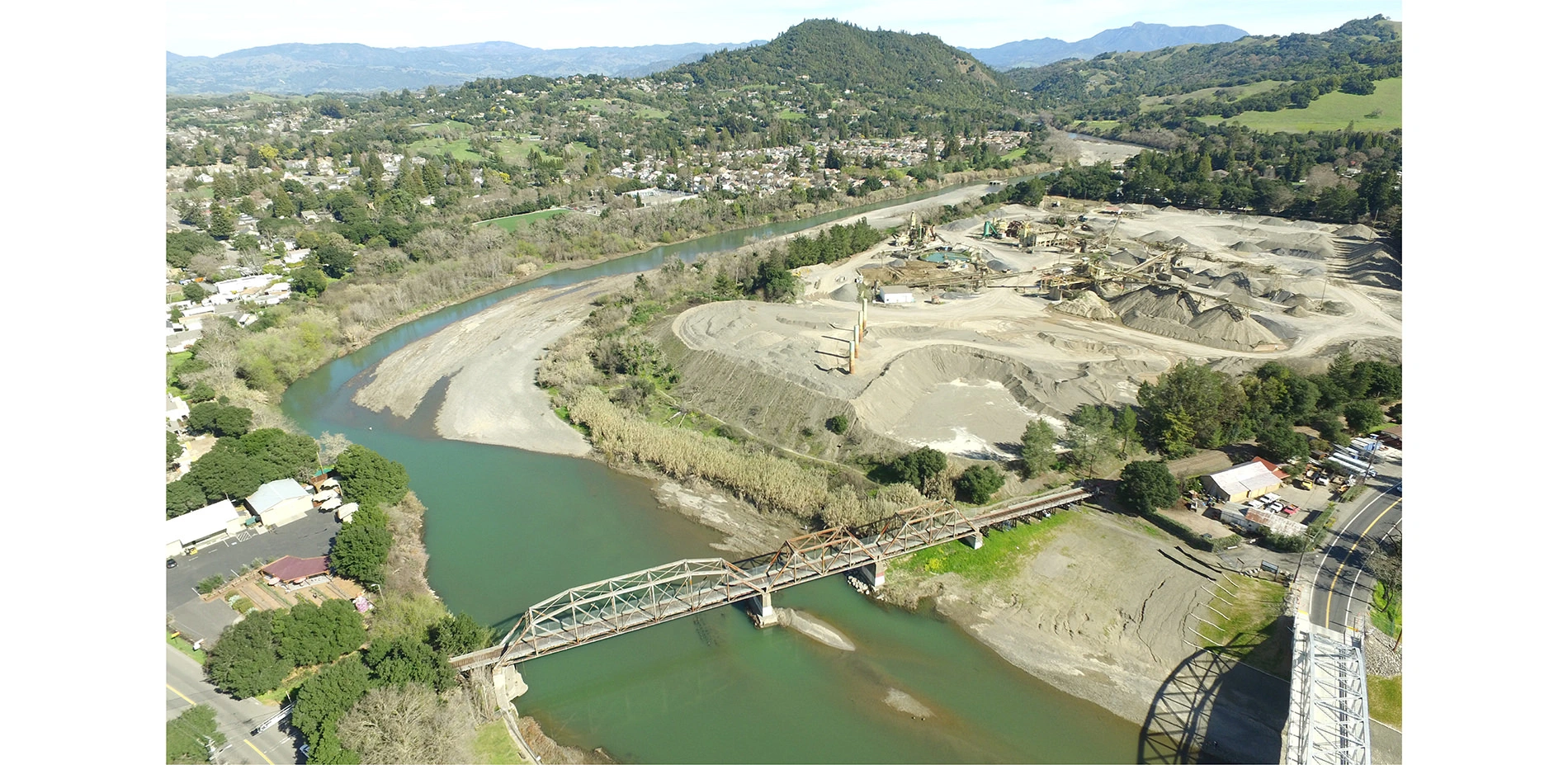 For over a century, large stretches of the scenic Russian River have been dominated by industry, leaving small towns like Healdsburg, California with a broken link between the community and the beauty and resources of the river. With over 60% of the town's riverfront occupied by a gravel processing facility on a site known as the Healdsburg Bendway, virtually no space is available for the needs of the people or environment.