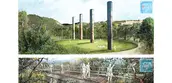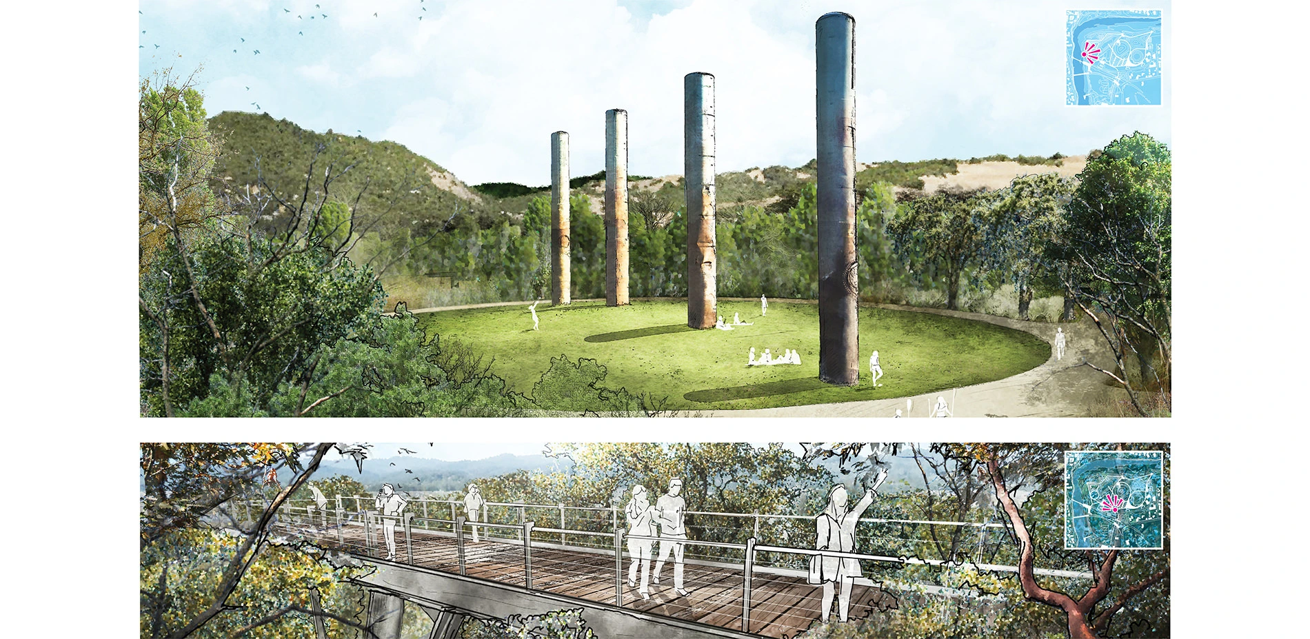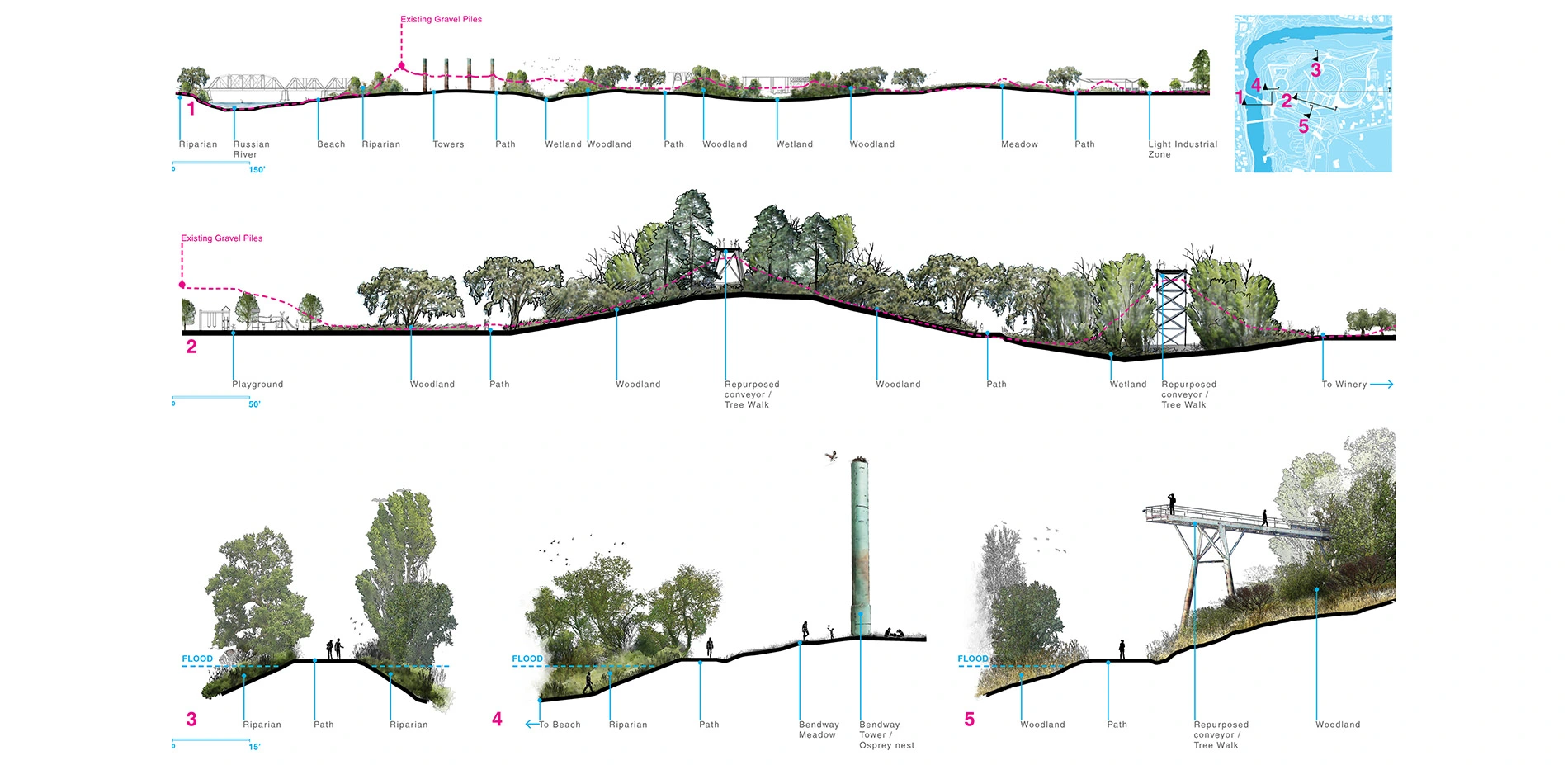Existing industrial elements play a unique role in the proposed design. The railroad bridge abutment has been retrofitted with river steps providing safe swimming, fishing, and Water Carnival viewing opportunities. The system of overhead conveyors has been repurposed into tree walks that immerse visitors in a California woodland while providing panoramic views of the site. The four Bendway Towers have been reinstated as the iconic symbol of the site’s history and provide a visual link to the town. At their base, a 200-foot diameter lawn offers a flexible space for public events and gatherings.