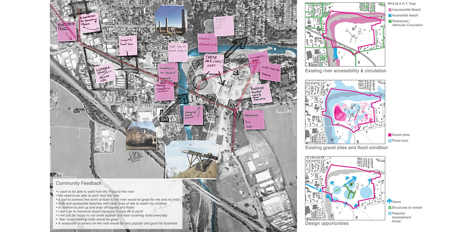 Meetings with local citizens including landscape architects provided crucial insight into the value people place on the river. It was clear that the people wanted to reclaim the river from Syar Industries and they desired a stronger visual and physical connection between the river and the town. Consideration was also given to economic strategies that would ensure that this proposal is a viable and practical alternative to the existing gravel plant.