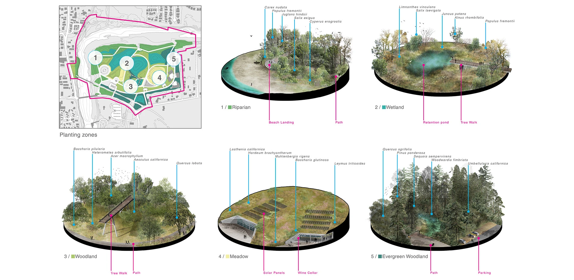 This proposal for the quarter mile stretch of riverfront at Bendway Park addresses both the community input and city directives. More importantly, it provides a vision that will re-connect the people of Healdsburg with their river by providing long awaited public access, economic sustainability, and habitat restoration. Studies of current and projected economic, environmental, and social issues have resulted in three distinct programmatic zones structured by circulation, a storm water system, and planting design.
