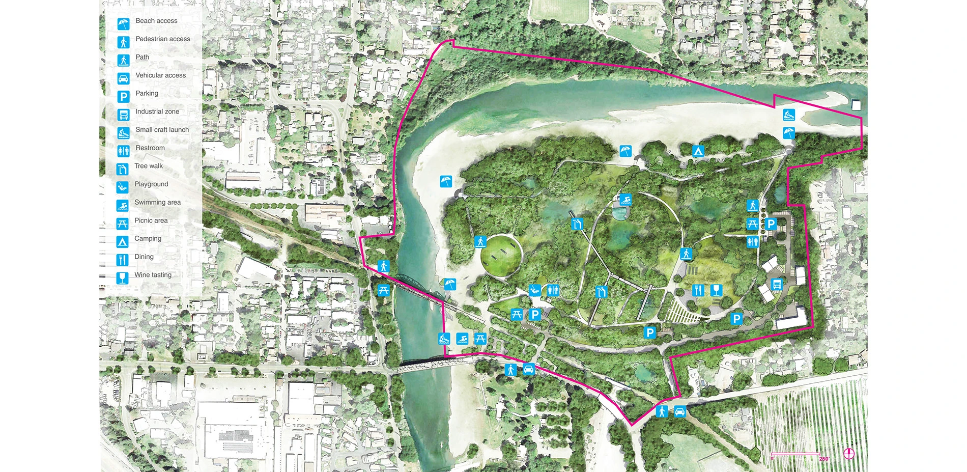 Memorial Beach Park is currently the only place that people can access the river in Healdsburg. Yet due to poor maintenance, overly priced parking, and limited beachfront this park is incredibly under used. It has become common for visitors to trespass on the adjacent Syar Industries property to access the more beautiful riverfront upstream. Recently, the area encompassing the Bendway and Syar Industries has undergone significant changes directed by the city’s General Plan. The Foss Creek Trail (completed in 2015) is a pedestrian / bike path that connects northern Healdsburg to Memorial Bridge and the project site. Plans are also underway for a residential and mixed use development to replace an existing lumber facility near the site. Future Sonoma Marin Area Rapid Transit (S.M.A.R.T.) trains from San Francisco will create more activity and increase nearby business and tourism. All this development focuses the spotlight on the derelict site and the need for transformation. This is reinforced by the following directives from the Healdsburg 2030 General Plan.