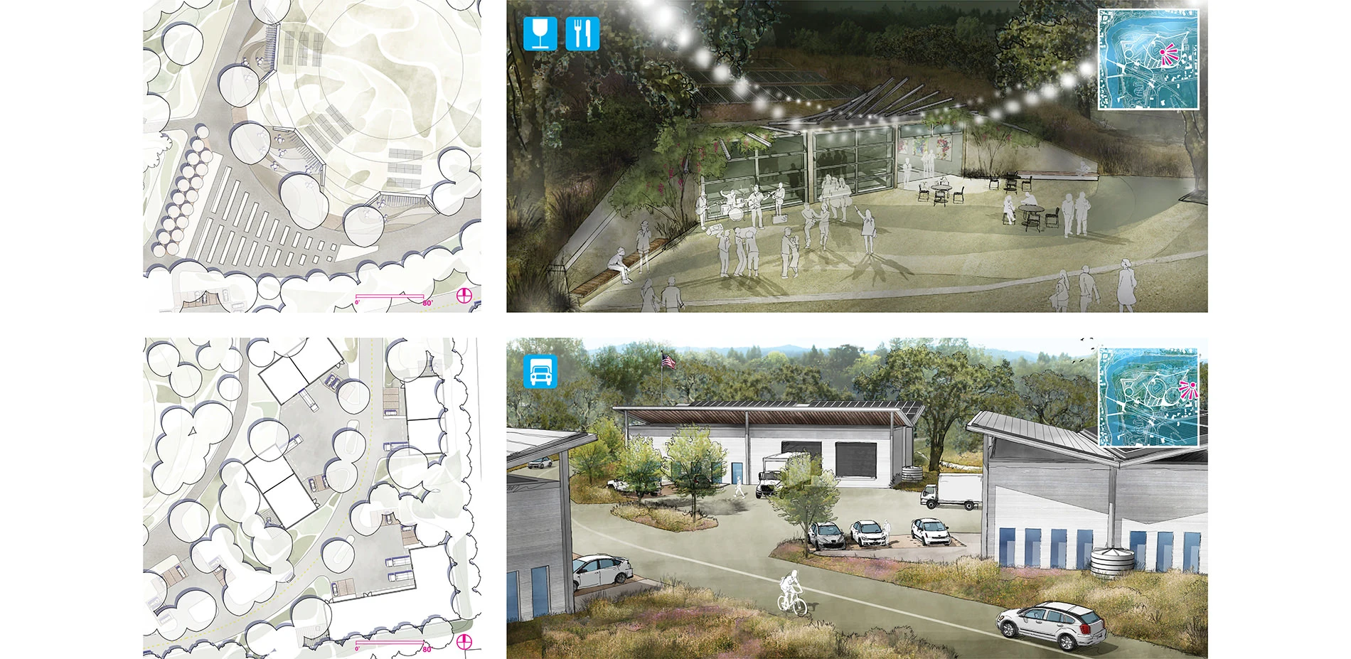 Zone 2 serves as the “economic engine” to support the long term financial stability and maintenance of the park. Four warehouses host a variety of uses such as office space and wine production. A wine cellar, whose form is inspired by the existing industrial equipment, serves as a venue for a dining and wine tasting experience under the shade of oaks and surrounded by flowing native meadows.