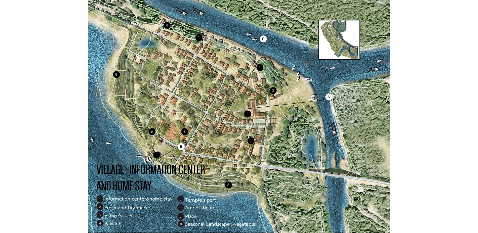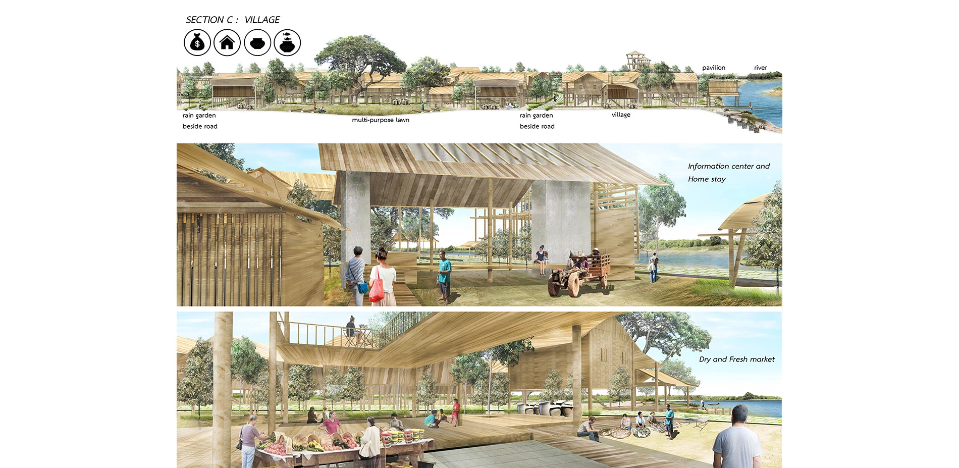 Developing a better Quality of Life is implemented by establishing new infrastructure to support social, economic, ecological spaces and socio-cultural spaces. Social space, four of the stations in Seasonally Flooded Forest are gateway between human and nature which is both welcoming area and recreational area for villagers and visitors. Ecological space, connection between human and their Seasonally Flooded Forest (Community Forest) is created by road from village to forest. Economic space, Fresh and Dry market, Village’s port, Plaza and Amphitheatre is created to be the gathering space and node. Lastly, socio-cultural spaces, created traditional plaza and temple’s port.
