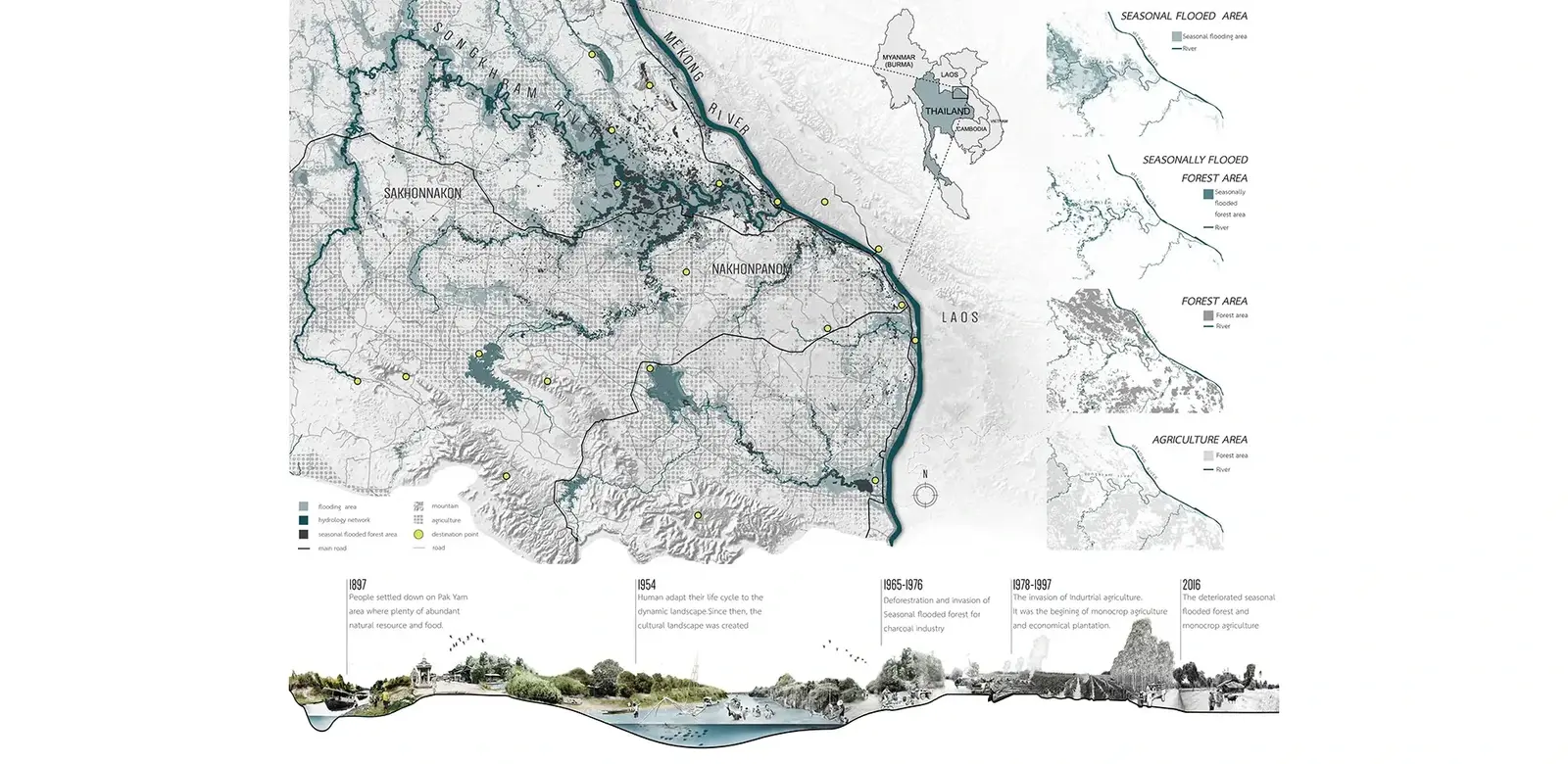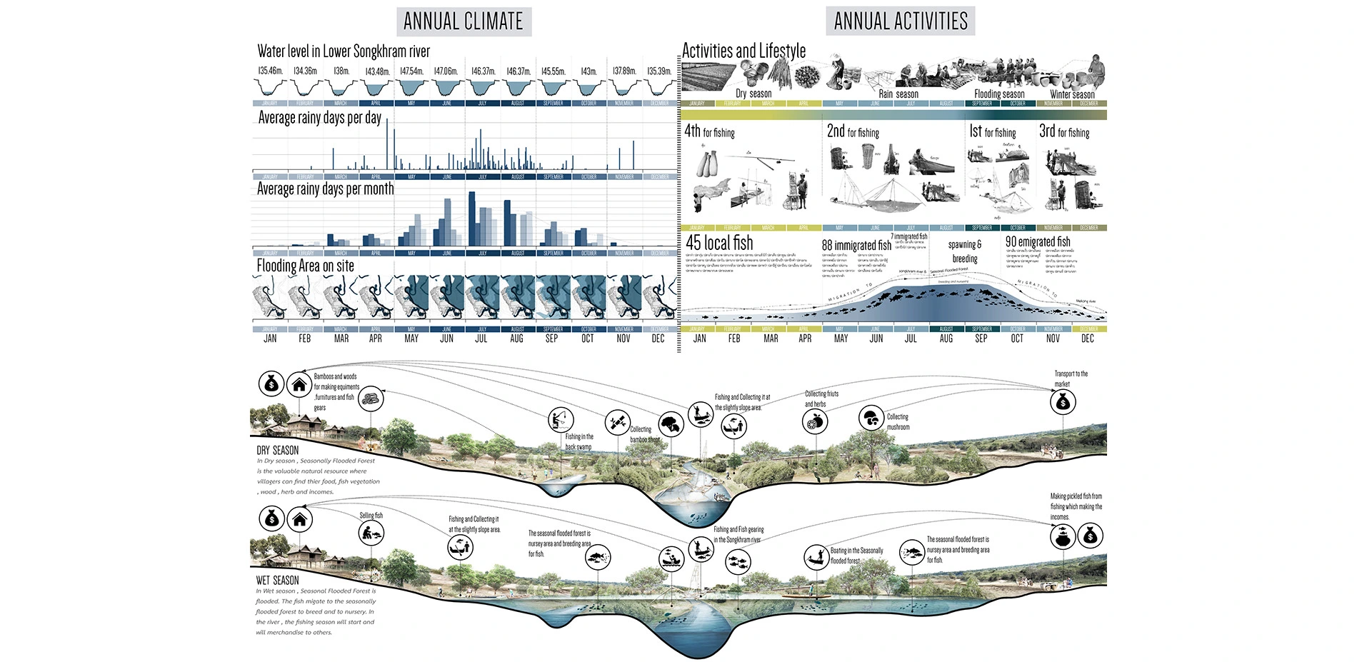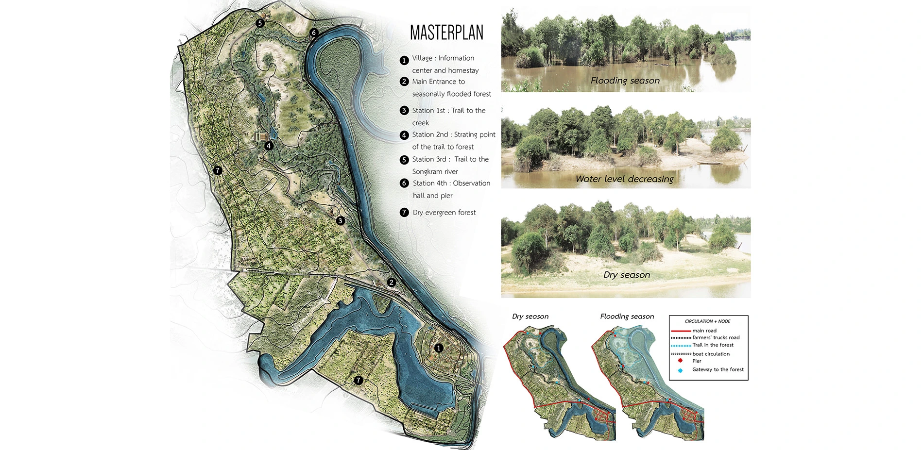Located in Nakhon Phanom province, northeast of Thailand, this proposal aims to reclaim and preserve Seasonally Flooded Forest that was trespassed and destroyed by charcoal industry and industrial agriculture since 1965. By restoring and conserving the seasonal flooded forest in area of Pak Yam village, a rural landscape is proposed to relink human to seasonally flooded forest which was harmonized between life and nature, to create the space for better quality of life and become Nakorn Panom's provincial tourist attraction, in terms of ecology and cultural landscape. Understanding this dynamic landscape that benefits positive effects toward human beings, Ecological Gateway to seasonally flooded forest, educational space between interface of seasonally flooded forest and Dry evergreen forest have been proposed to the area. Through analysis on seasonally flooded area, landscape character, vegetation, annually activities and site potential, adaptable design is the key for living on this area and symbolizing the awareness to other people.