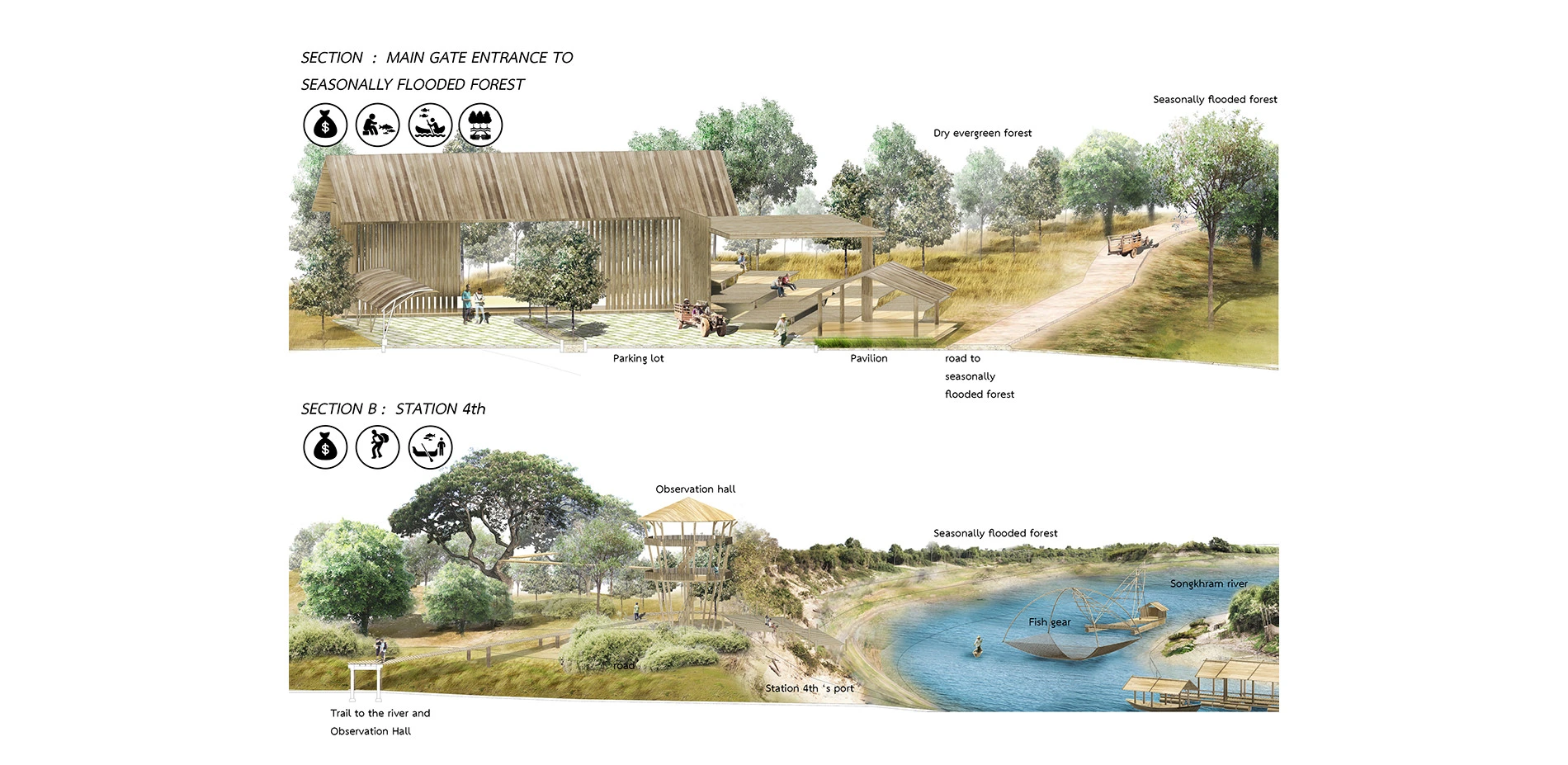 It is divided into 5 main sections which are the knowledge and reclamation center, ecological forestry, homestay area, community's public space and agricultural farm(which has been adapted to suit the basin's context). The planning and designing concept focuses on the flexibility and dynamic of the ecosystem in both rainy and drought seasons. To successfully design the project, it is essentially needed to understand the details of natural process in Songkram basin and other related knowledge in various fields to be integrated into the planning method that could practically reciprocate to both development and conservation at the same time.