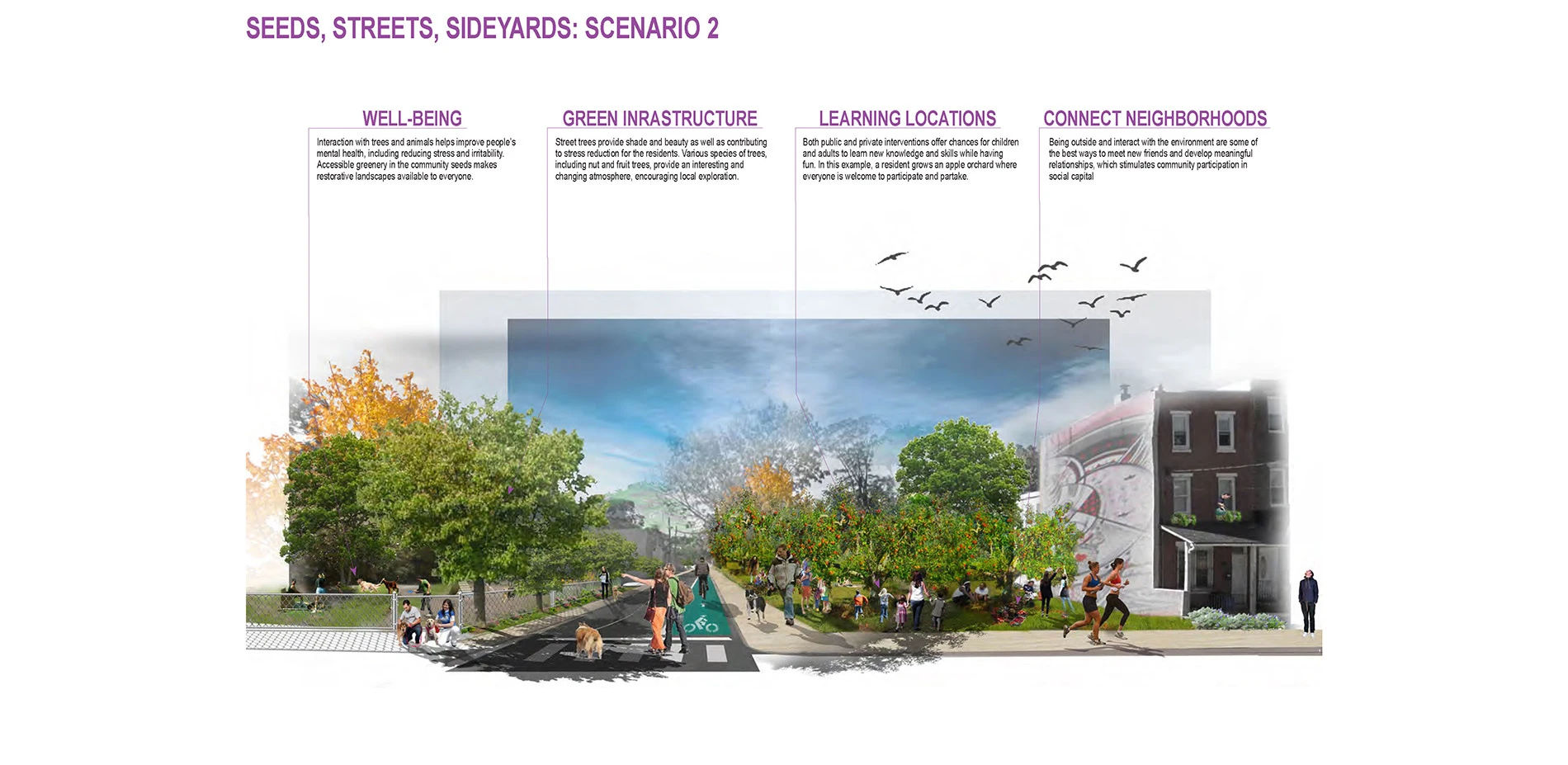 The team members for Seeding Sideyards consisted of 2 graduate students of Landscape Architecture, 2 Ph.D. candidate of Landscape Architecture, 1 Ph.D. student from Landscape Architecture, 1 graduate student of Architecture, and 1 Ph.D. student of Landscape Architecture as a visualization specialist. The students have been studying the impact of landscapes on human health and strongly believe in the relationship between nearby nature and human health. This has been reflected in the design strategy and planning of the Belmont-Mantua neighborhood.