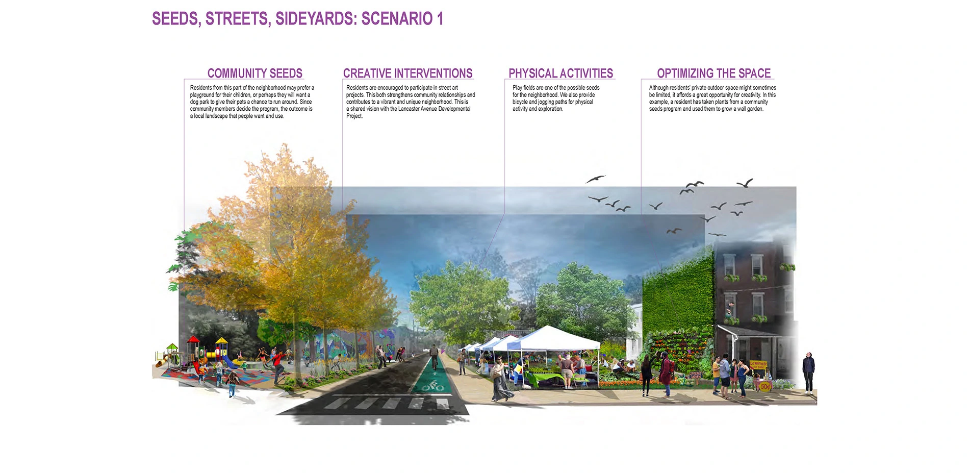 Our design makes the Belmont-Mantua neighborhood a place of infinite destinations by spreading seeds. It creates public destinations, or seeds, as incubators to stimulate neighborhood growth. Here, residents can learn skills, discuss ideas, and get toolkits, seedlings, and saplings for their personal landscaping. This plan also provides resources for public engagement and reinvigorating private spaces and sideyards. Residents themselves will change the character of their yards and neighborhood.