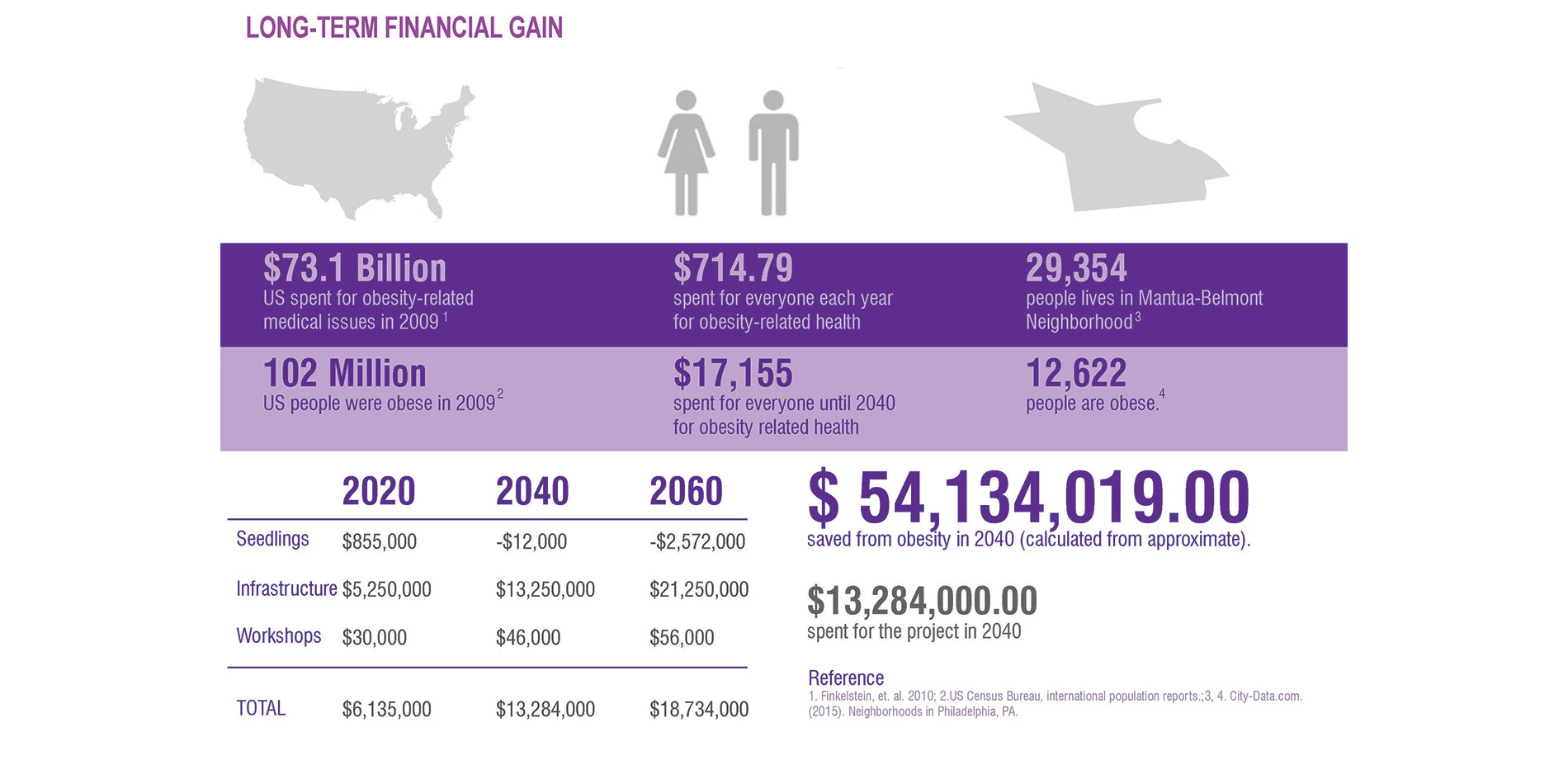 Once the community hubs are created in 2016, neighborhood and yard innovations will begin to spring up. Eventually, this will lead to a woven pattern of community activities, vegetation and productive landscape, and installations with potential for future growth and strong connections. With customizable designs, our seeds grow and extend for years to come, adapting to new technology and community needs. By 2060, the walkable and dynamic neighborhood continues to be a place where people can grow and thrive. Physical activity and community-building activities are integral parts of residents’ lives. With strong social support and constant exercise, obesity will only be a forgotten problem of Belmont-Mantua neighborhood.