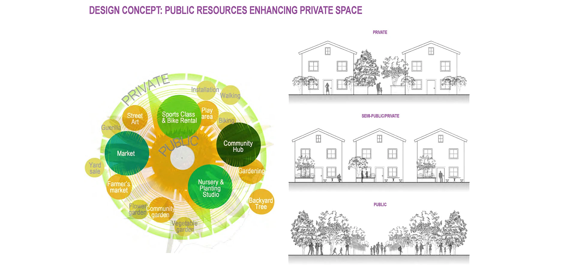 We then improved the ideas of our sideyards and seeds through our project leader. The MLA students then produced the perspectives and sections, while the Ph.D. student and candidates worked together on the master plan and network analysis. The architecture student calculated the budget of the project and produced conceptual diagram explaining our design concept.