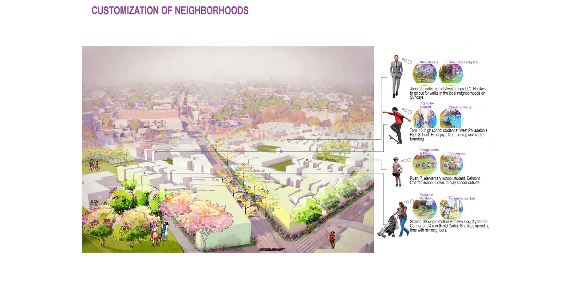 As we progressed deeper into research and analysis, we invited the visualization specialist to discuss Philadelphia in the future years. Another MLA student initiated the concept about customization design, which she developed into a diagram with some help from the master’s student from architecture. After the conceptual design was done, one of the Ph.D. candidates organized a pin up and invited professors to review the project.