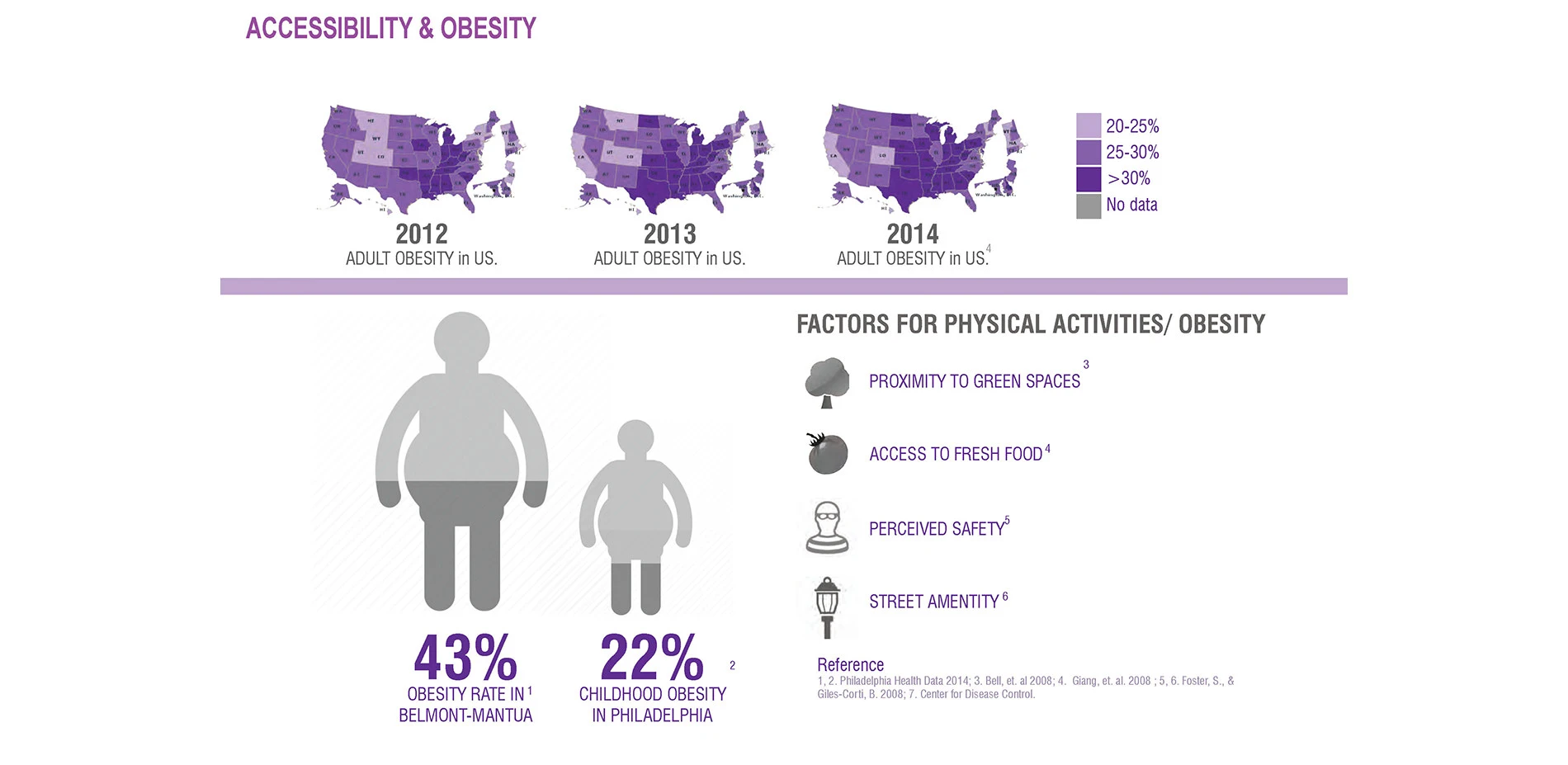 Our project, SEEDING SIDEYARDS, focuses on the issues of the Belmont-Mantua neighborhood near downtown Philadelphia. Our long-term mission is to create an environment that improves people's physical and mental well-being. Because of our mission, we investigated the problems within the neighborhood and identified one biggest health issue there: obesity. With 43% of Belmont-Mantua citizens obese, the whopping 10% higher than the national average and anywhere else in Philadelphia, the number constantly increases. We had a serious, complicated issue in our hand.