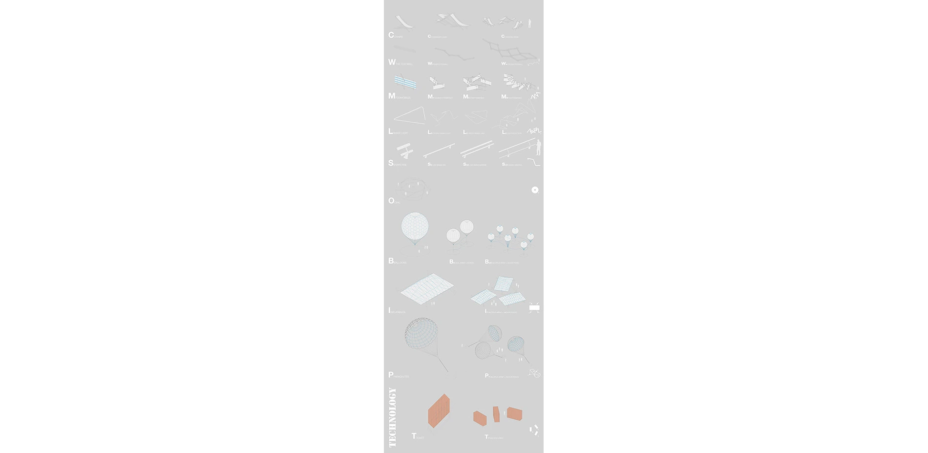 - TECHNOLOGY: The technological component of Fogfest starts from the creation of a series of devices that evolve from the idea of the deck chair as an artifact that can create pop-up space. After a series of modifications, the adaptability of 'pair of scissors' type structures is taken further to develop retaining walls that can adapt to different road geometries, and also a fog collection device called "The Fogmobile." This artifact would have a protagonic role during the festival, being able to be deployed on site to collect fogwater, and then folded, attached to a car, and pulled as a trailer to a different site. On the other hand, there's a series of structures that develop on the idea of 'the line' as an element that can create space by bending, but that can also provide structure for the festival's participants to attach their devices (balloons, inflatables, fabrics, mesh, etc). The Snake rail creates a simple roadbarrier with 3 different adaptations to create a linear bench, a double roadbarrier, and a simple handrail. On the same line, are the Light Sculpture and the Oval, two elements that are pecifically designed to become anchor structures for inflatable / planar mesh devices. These linear elements after the festival is over, will continue to provide spatial structure and character to the outlook points of Highway 1. As the festival takes place mostly over night and early morning, light will become a crucial element to work with. The Light Chamber (toilettes) and the Light Sculpture will act as lighthouses, creating reference points that will provide the participants with the sense of distance and the amount of fog coverage during the night. All of the other elements like balloons, inflatables, parachutes, fabric fogcollectors, etc, should be brought to the Festival by the participants. These open source piece of the Festival is what will provide dynamism to the landscape, transforming Highway 1 into a landscape of the unexpected, a space open for new relations between human beings and the air.