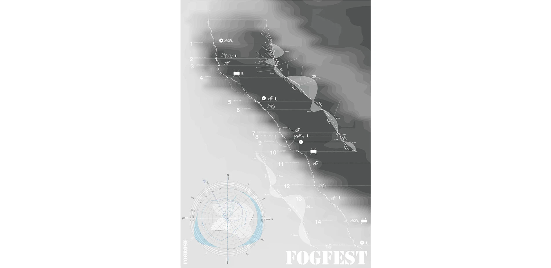 - FOG: Fogfest is obviously a festival about collecting water from the clouds, however collecting fogwater is anything but obvious. This needs careful schedulling, because fog is not always present on Highway 1 throughout the year, and also there is a specific time during the day where the chances of collecting fog water are higher. This is why I developed a 'Fogrose,' which as a more complex relative of the windrose, combines data of fog presence during a normal year, with fog collection data in an average day. The best time for the festival is from June to September and the fog shows up usually at night and early morning. The Fogrose not only mandates the time for the festival, but also the Festival's schedule of activities. Fogfest must happen on a weekend during August, with the fog collection starting at 12am and ending at 10am, during the first and second nights. During the day, the participants’ setup their devices and also teach / learn from the other participants. The third day is a party and then wrap up. Fogfest is not only an opportunity to create environmental awareness and learn about our interactions with the atmosphere, but also an opportunity to improve fog collection technology and have fun.
