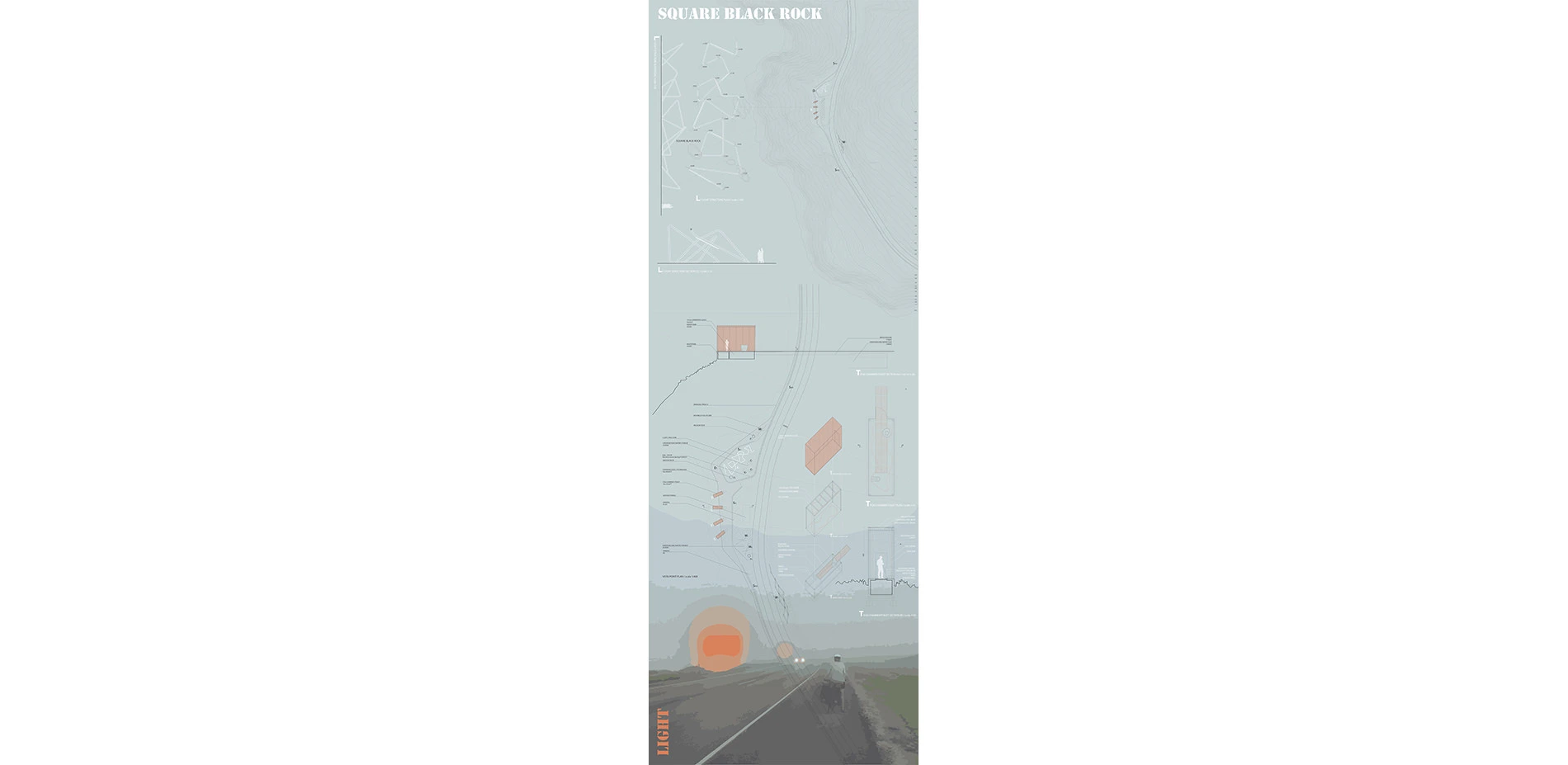 - Square Black Rock. The Light Sculpture and the Light Chamber. This site is configured by the snake rail to create a main area for the light sculpture on the north side, and also 4 light chamber (toilettes) alog the edge. Each one of these frosted glass wall toilettes is pointed directly to each one of the largest rocks right next to the cliff. The site would become a major reference point during the nights of the festival.