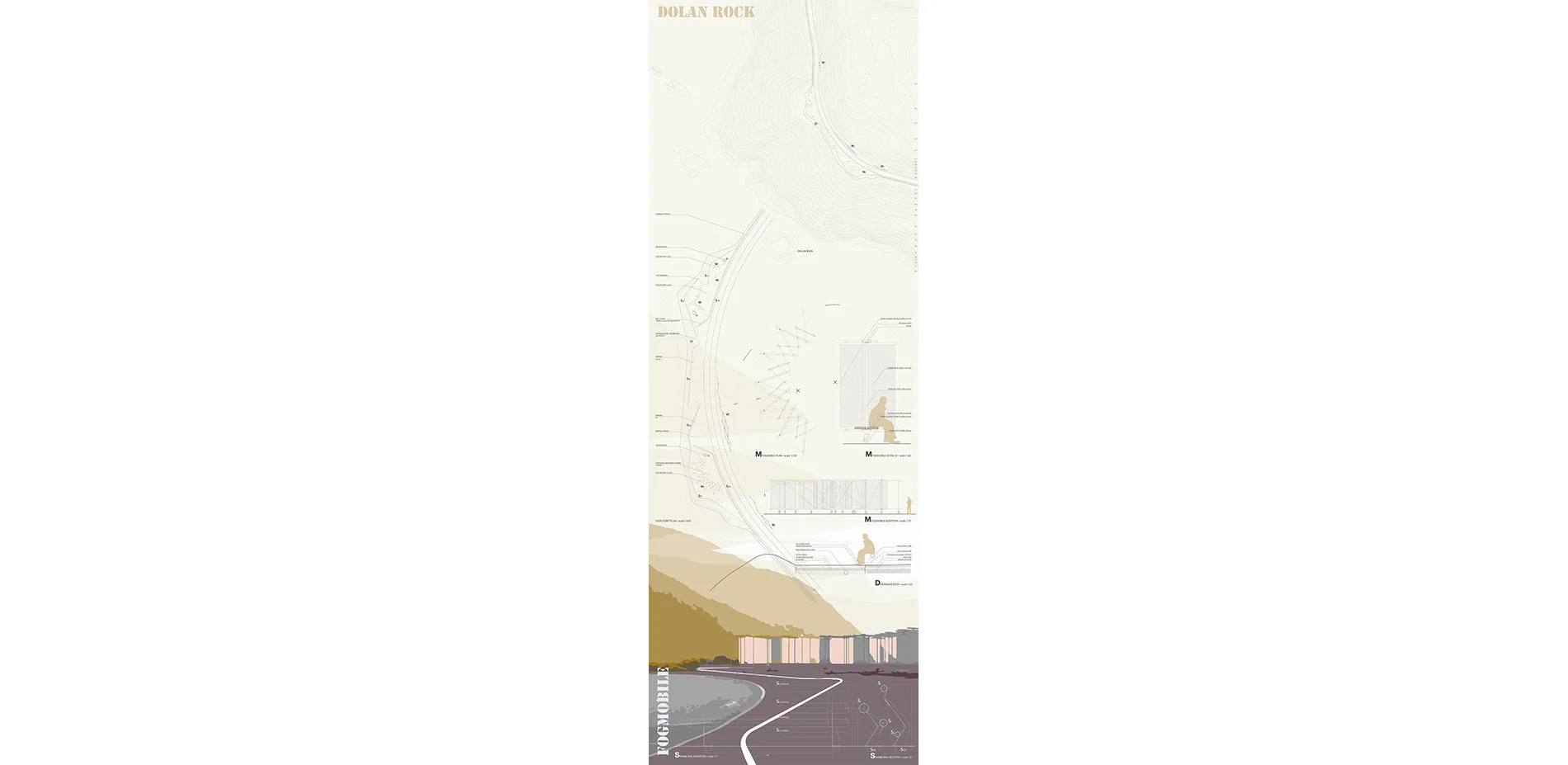 - Dolan Rock. The Fogmobile: This long site provides two main areas for deploying fog technologies on the extreme sides, configured by bending Snakerail road barriers. At the center, plenty of parking space is provided, and at the edge, the drainage promenade creates space for a long walk along the cliff to contemplate bith the horizon and the Fogmobiles. The fogmobiles would be deployed on the two main asphalt areas to collect water during the festival.