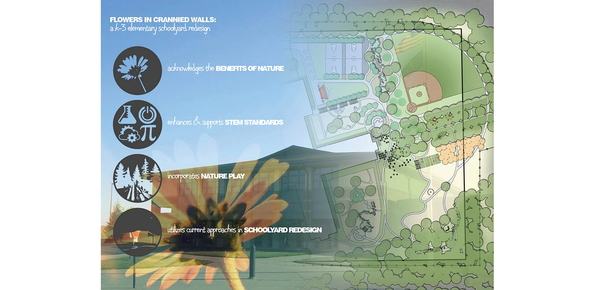 Nature and the rigid walls of academic disciplines do not have to exist in opposition to each other. Instead, as this project demonstrates, through proper analysis, nature and design can be used as a tool to enhance STEM subjects. A schoolyard may be redesigned to function as not only a place of unstructured play but also a place that maximizes opportunities for teaching and learning. Like a flower in a crannied wall, the schoolyard can become a place that quenches, in part, the thirst of a 21st century child in need of exposure to nature, giving our children an experience and an opportunity to “understand the root & all, & all & all”. This poetic phrase being perhaps, the primary goal of STEM and standards-based education after all. -