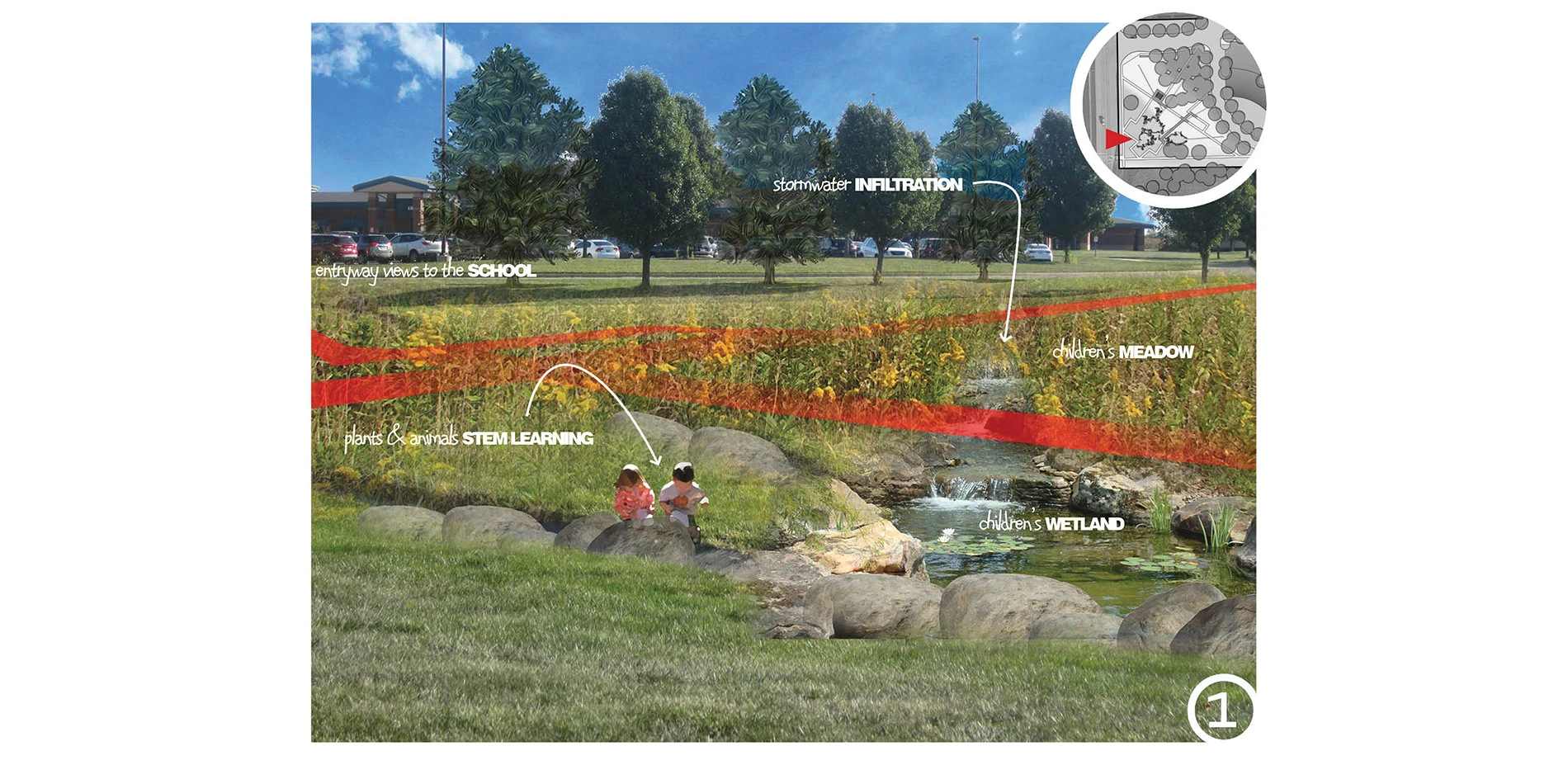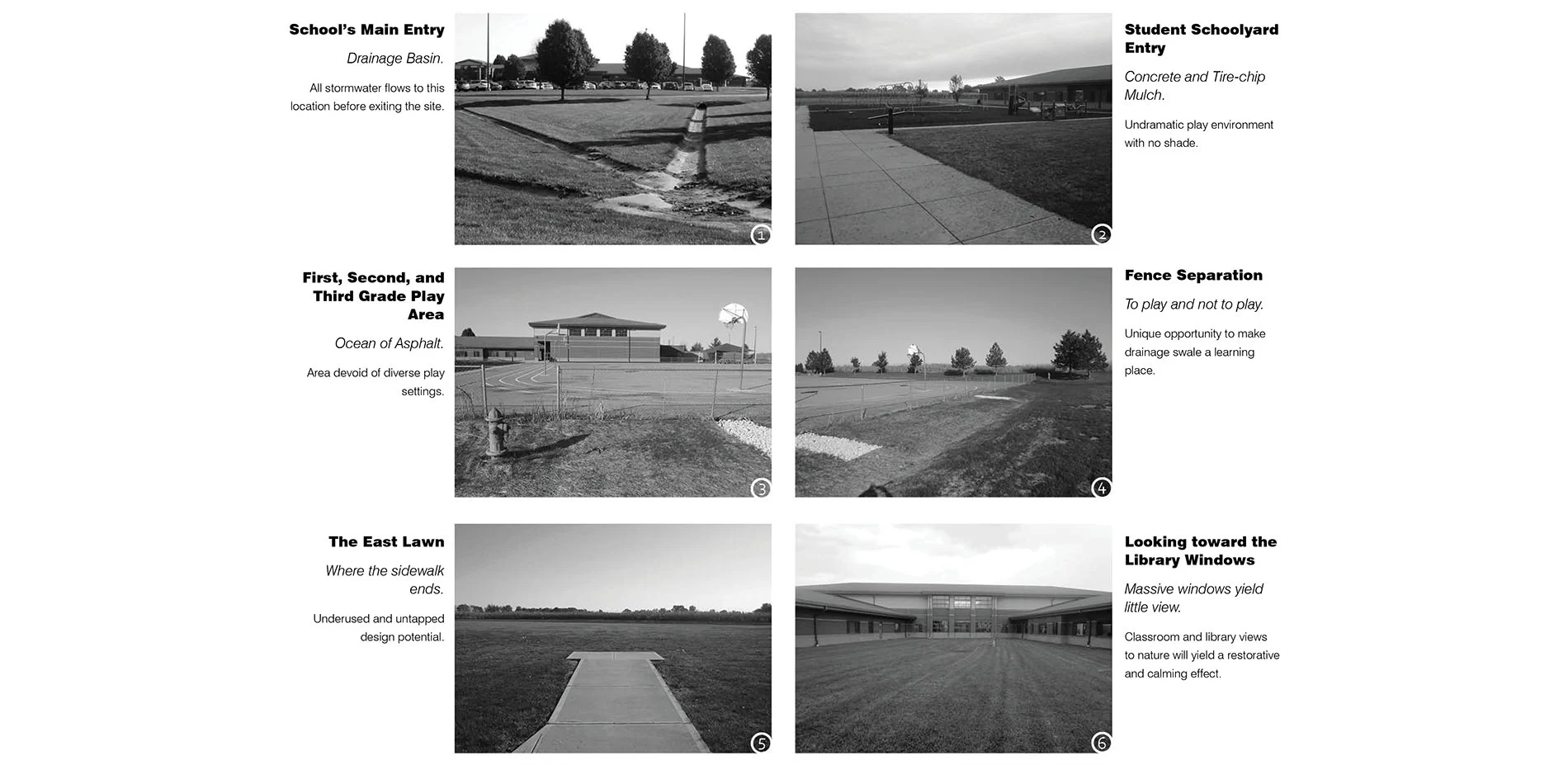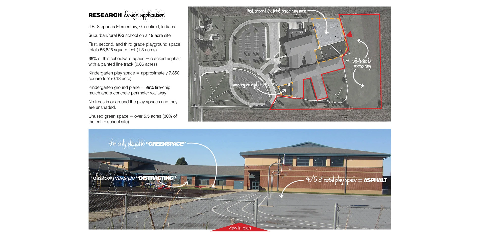 The project utilizes these research foundations and conceptually applies them to the schoolyard site at J.B. Stephens, a K-3 elementary school in Greenfield, Indiana. -