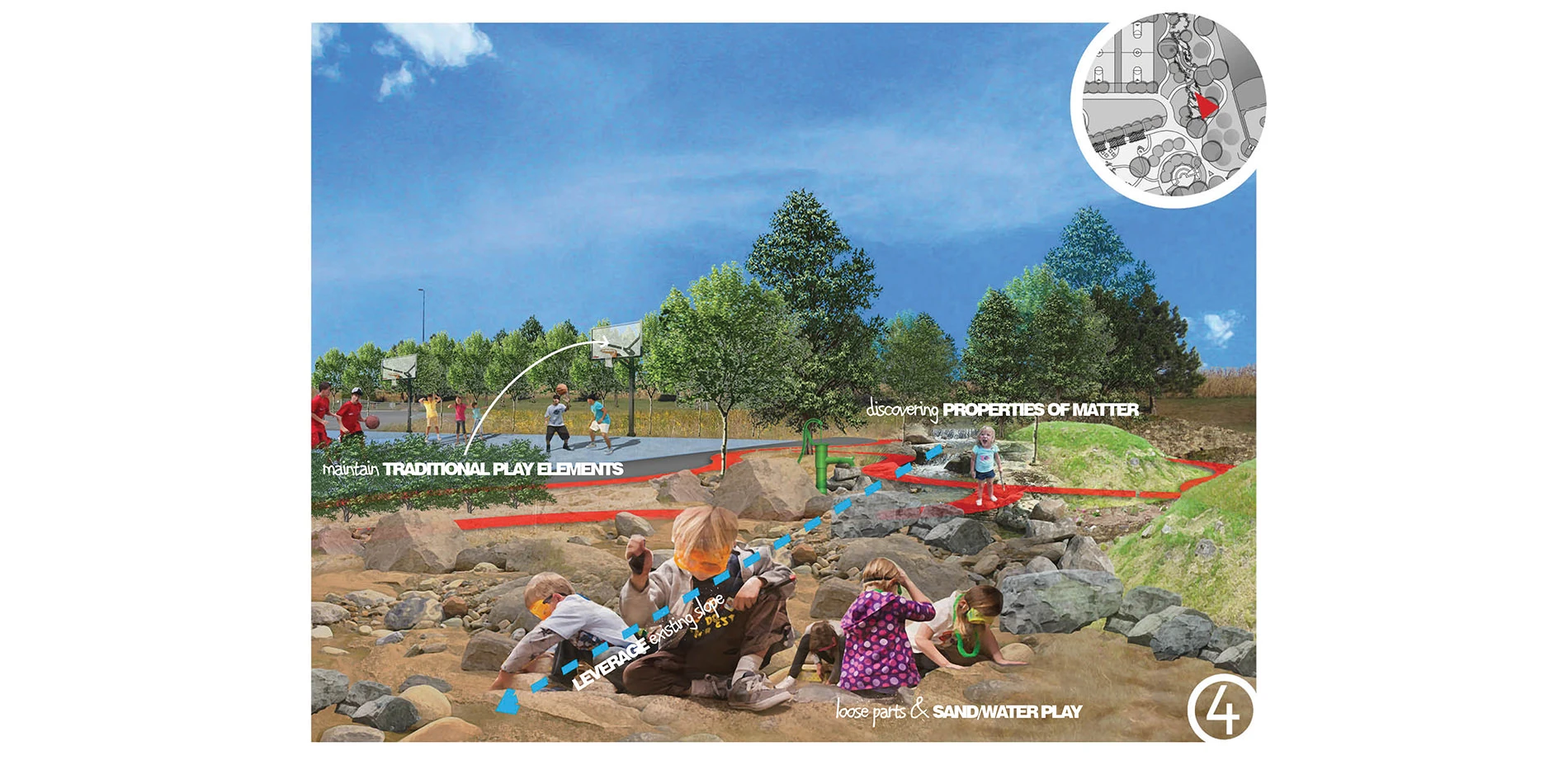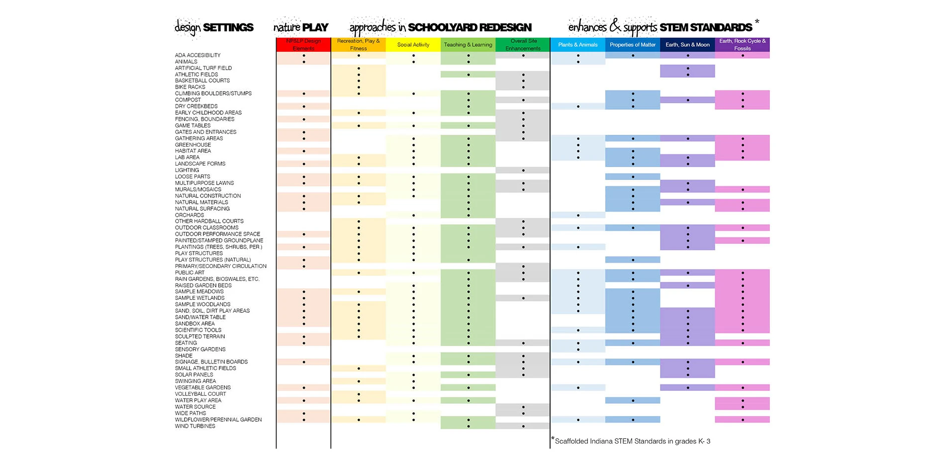 This project aims to advance the value of the landscape designer who analyzes Indiana STEM standards and then connects those standards to the specific designed environments/features with which they align. In this way, the designer provides a tool for school administrators, legislators, and decision-makers to see, articulated and illustrated, the explicit links between STEM and designed nature play spaces. Consequently, by designing with STEM in mind, the project opens itself up to be potentially funded by grants/monies geared towards STEM learning; “Playgrounds do not get funding, outdoor learning environments do” (Moore & Cosco, 2015). By using schoolyards as a location to create these outdoor learning environments, the benefits are manifold. Proponents of STEM see illustrated connections and an enriching way to support STEM learning. Schoolyards in need of renovation become natural learning environments creating a win for the nature play movement – connecting children to natural elements & research-proven benefits of nature. The schoolyard (a common element in most communities) becomes an access point to nature, natural elements, and play in a meaningful place. The community benefits from increased natural green space, not to mention, the many other sustainability benefits such as stormwater management, habitat creation, etc. These benefits align with many of the current principles of landscape architecture.