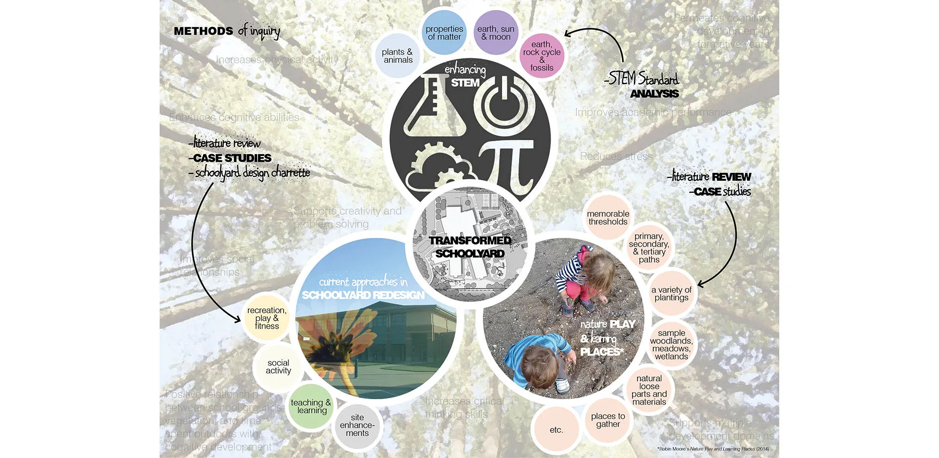 Studying a relationship between landscape architecture and education, this research operates under three timely and significant ideas: the widely-held notion of a floundering relationship between children and nature, standards-based education, and schoolyard redesign.