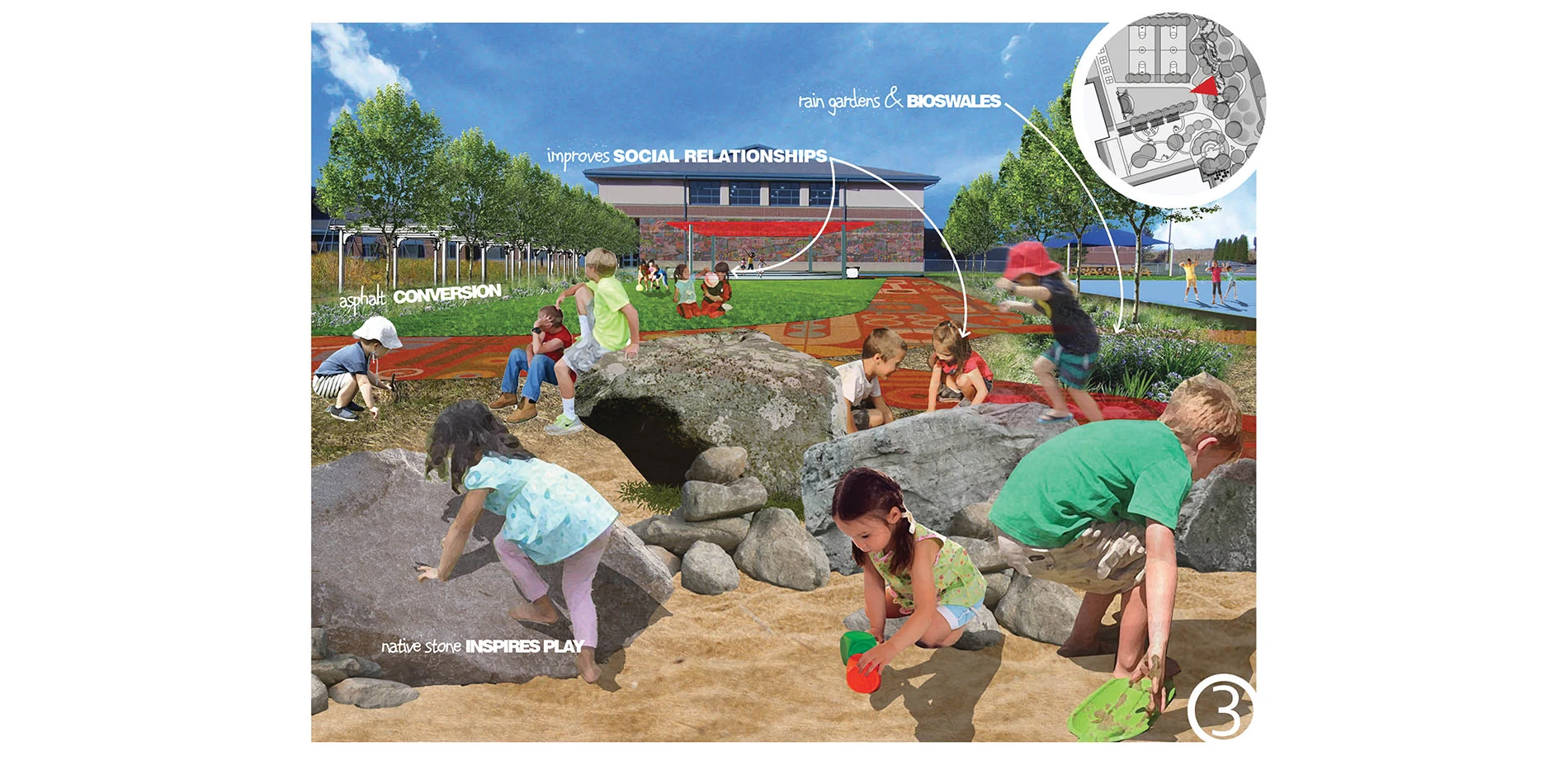 Schoolyards are quickly becoming thought of as highly valuable public assets. For some communities, they are they only viable, playable, and accessible “green” spaces. Unfortunately, these “greenspaces” are not all that often green, rather, many consist of exorbitant amounts of asphalt, little shade, inadequate or outdated play structures, and potentially harmful tire-chip ground surfacing. The benefits of schoolyard redesign are not only experienced by the students but can also be felt by the teachers/administrators as well as the surrounding community. Various groups have taken a great interest in the value and potential that schoolyards have in their local communities for play, learning, stormwater management, neighborhood strengthening, crime reduction, community events, programming, physical activity and exercise, etc.
