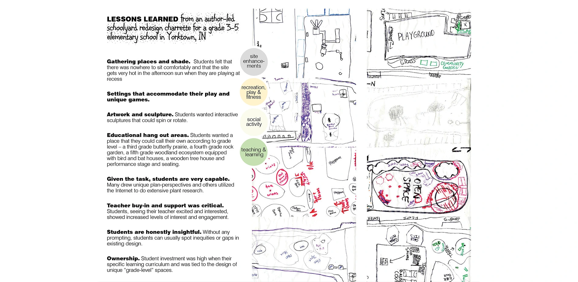 In 2014, the author was personally asked to conduct a design charrette with the fifth grade classes of Yorktown Elementary. The students desired to re-imagine the playground of their school. Students drew base plans of the existing schoolyard and collected digital images of outdoor play spaces that they were attracted to or in which they wanted to play. Acting as student-designers, the students prepared questions to ask the principal about her desires for the schoolyard. In the final meeting, students shared their drawings with the rest of the school. Lessons learned from this experience were profound.