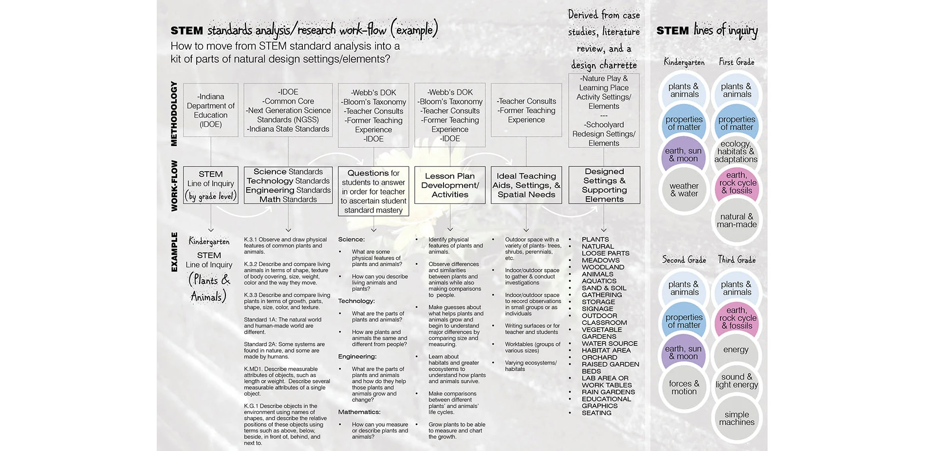 Critical to this project is the identification/analysis of the state education standards that relate to STEM. Using curriculum maps provided to educators by the IDOE, this project identified the K-3 overarching lines of inquiry, overlapping grade-level themes, and essential vocabulary. In addition, the project employed the author’s former experience as an educator to compile a list of specific teaching tools or elements necessary to effectively teach those STEM lines of inquiry. This list is non exhaustive and was confirmed/added to by a current JBS teachers. Together, those tools, aids, and ideal spatial requirements helped to inform various types of designed spaces and elements (derived from a multitude of schoolyard redesign and nature play case studies) that maximize opportunities for STEM teaching/learning.