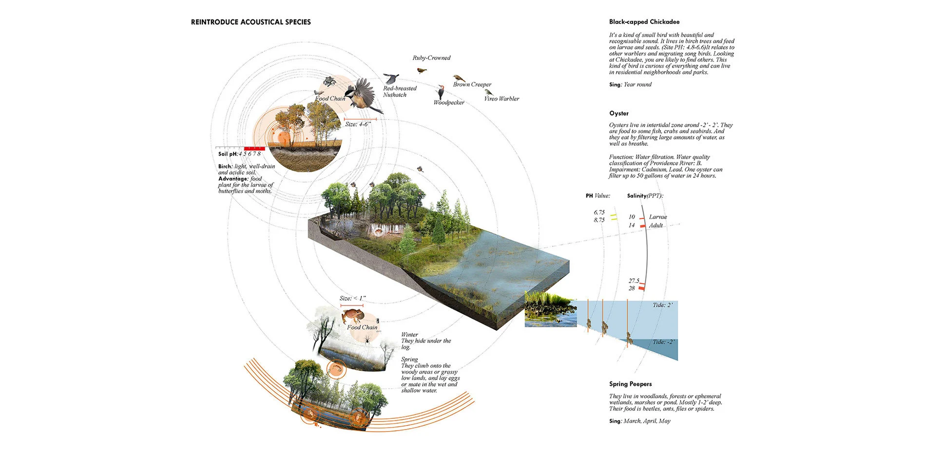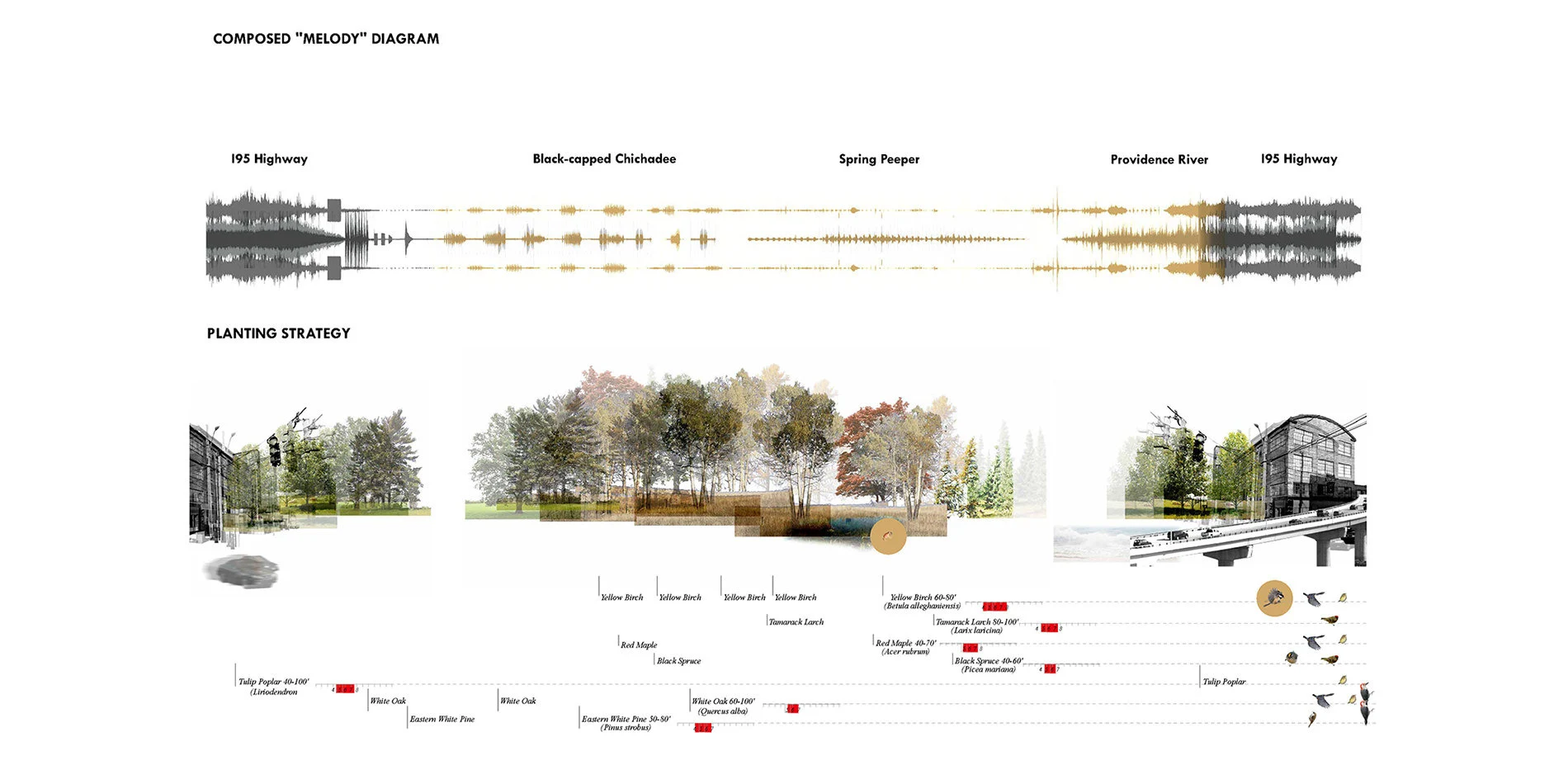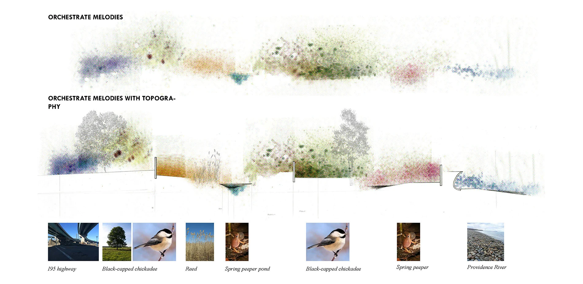 The design for South Pier Park in Providence, Rhode Island, seeks to provide habitat for species as well as human access to the waterfront in an urban context. By introducing two main target species with strong acoustical characteristics, the proposal of this project develops a sound co-habitat. When going through from the city to the water, visitors experience a transition from the sound of the I-95 highway into the site, moving from the sound of cars and horns, to friendly conversation, to reeds blowing in the wind, water flowing, kids playing, birds’ singing, spring peeper whistling, wave lapping…