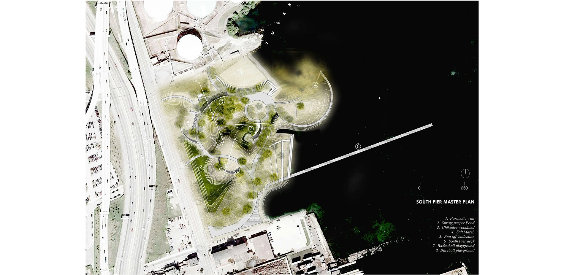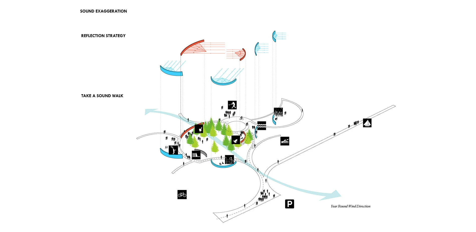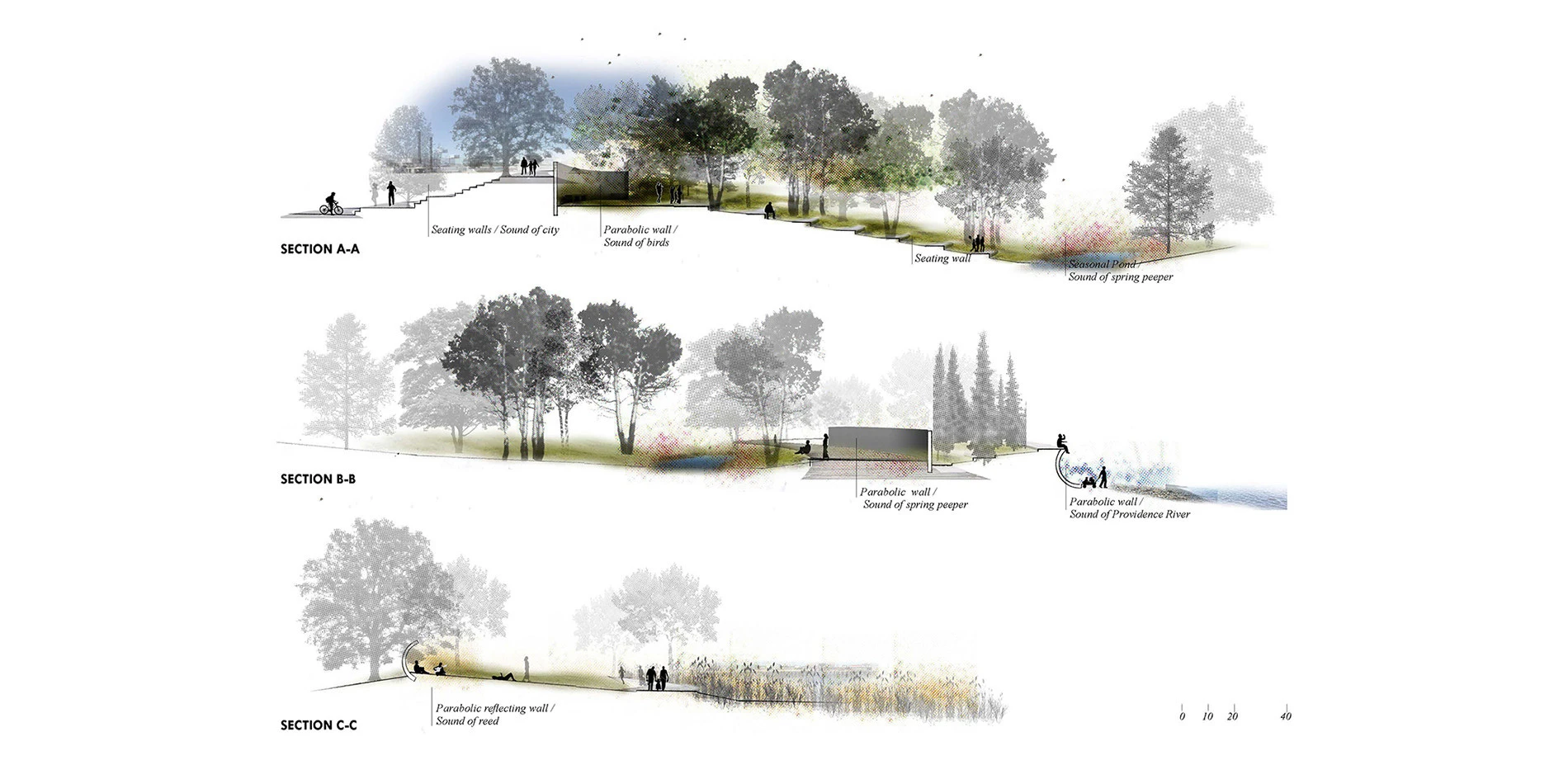 The design for South Pier Park in Providence, Rhode Island, seeks to provide habitat for species as well as human access to the waterfront in an urban context. By introducing two main target species with strong acoustical characteristics, the proposal of this project develops a sound co-habitat. When going through from the city to the water, visitors experience a transition from the sound of the I-95 highway into the site, moving from the sound of cars and horns, to friendly conversation, to reeds blowing in the wind, water flowing, kids playing, birds’ singing, spring peeper whistling, wave lapping…