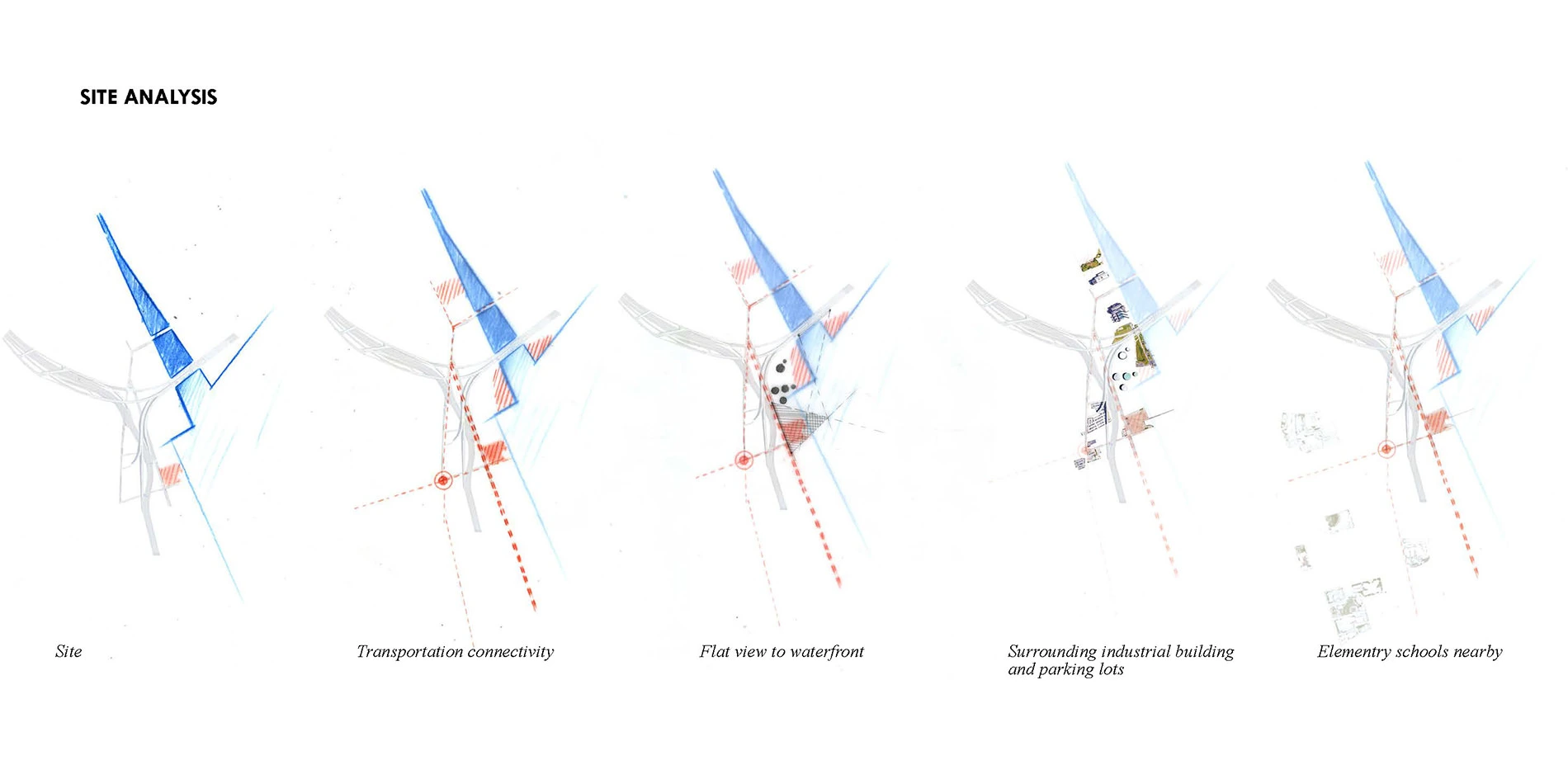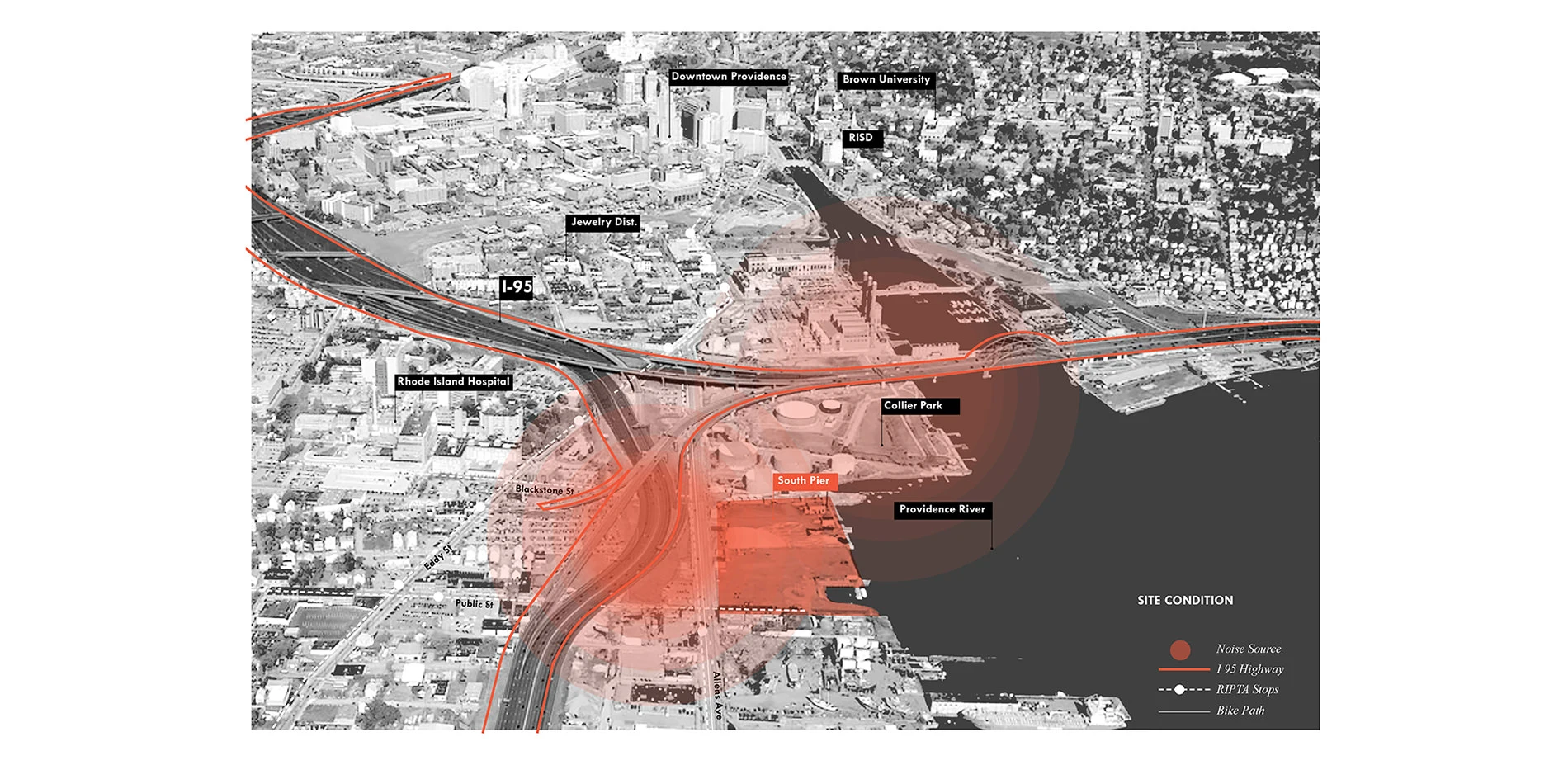 Located 1-mile south of Downtown Providence, the South Pier was historically an industrial pier for shipping and now is vacant. The I-95 highway next to the site acts as a barrier and disconnects the site to its neighborhood and downtown. The sound of heavy traffic from the highway predominate the site. Thus, this project seeks a new way to investigate sound experience by orchestrating a series of new melodies of sounds from different species, and reshape the relationship between ecology and urban system. Additionally, this can provide opportunities to be designed as the choreograph of urban experience.