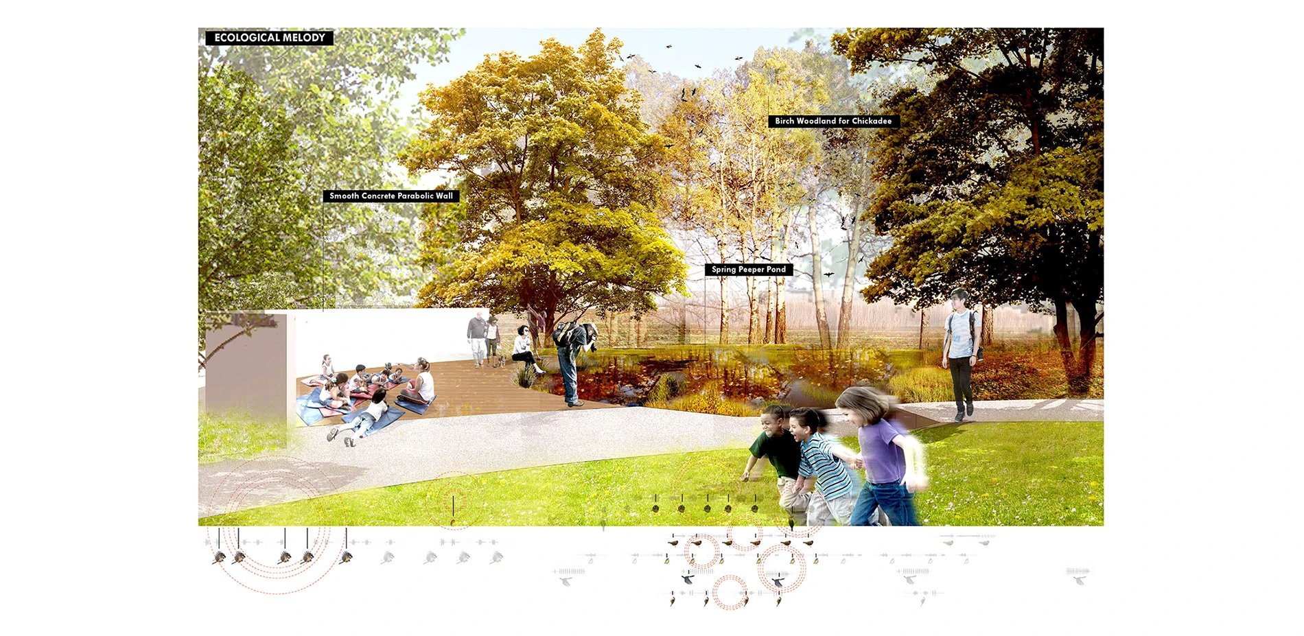 The project seeks to introduce black-capped chickadee and spring peeper, which have recognizable acoustical character. By creating a main birch forest combined with other trees, the goal is to provide food and shelter to attract black-capped chickadee, which has high-pitch song like flute, as well as other migratory song birds. In addition, habitat is created for spring peeper, a small frog, whose recurring cheeping whistle marks the onset of spring in rural New England. Through the creation of shallow ponds, the project aims to bring the characteristic peeper sound into the city. People can become aware and educated about the species not just on a visual level, but also on an acoustical level.