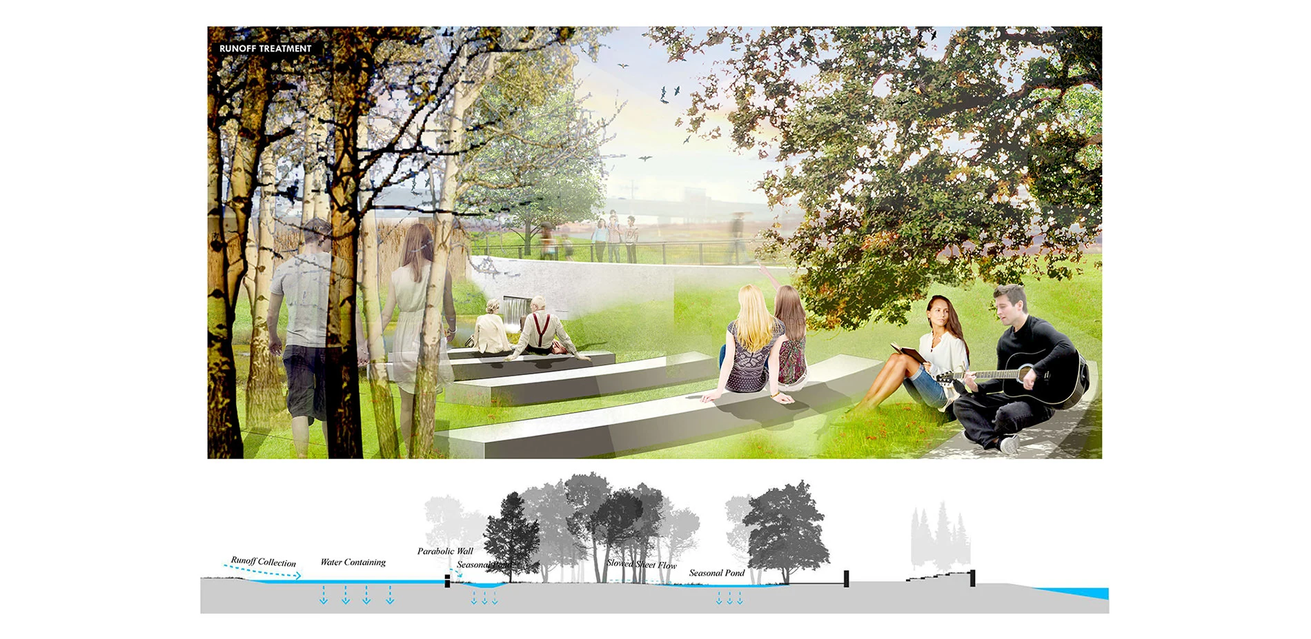 To enhance and concentrate this acoustical experience, parabolic walls are designed to reflect sound, which serve to exclude the highway noise. These walls also provide moments for visitors to gather and sit down for listening. Additionally, these multifunctional structures are also for city runoff collection. Fresh water can be collected and treated during raining seasons and be kept in certain level to maintain the 2-inch deep requirement of spring peeper habitat.