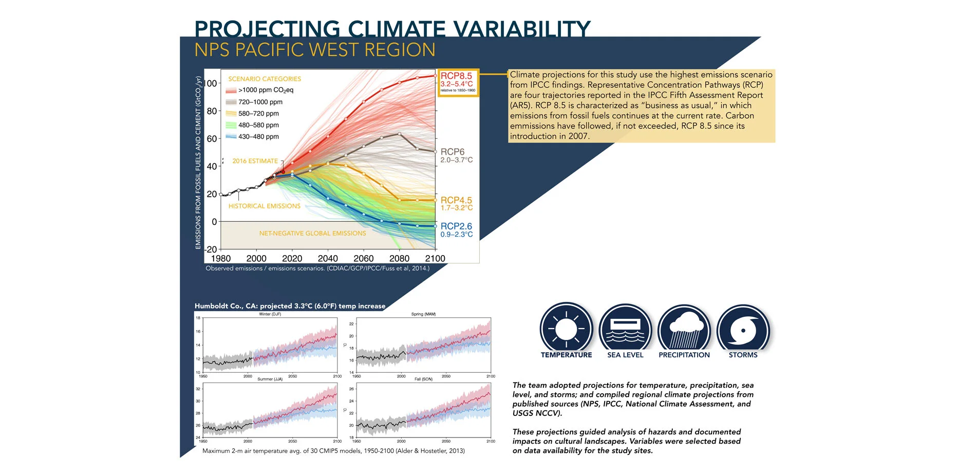 Collect and compile climate change projection data for 164 cultural landscapes in 43 parks across the Pacific West Region, including, but not limited to, climate change trends in air temperature, precipitation, and sea level.