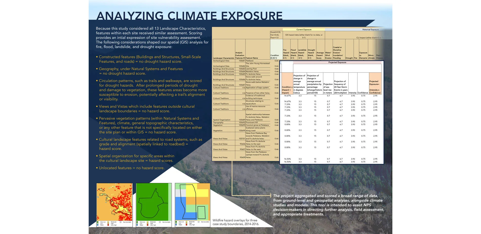 The newly designed vulnerability assessment matrix models exposure of character-defining cultural landscape features, according to climate change projection data. Exposure describes “the presence of people, livelihoods, species or ecosystems, environmental functions, services, and resources, infrastructure, or economic, social, or cultural assets in places and settings that could be adversely affected” (IPCC 2014), amended here to frame how climate change might adversely affect the cultural landscape features. The matrix aggregates and scores a broad range of data, including ground-level and geospatial analyses, alongside climate studies and models. This tool is intended to assist NPS decision-makers in directing further analysis, field assessment, and appropriate treatments. There were four major criteria included in the scoring system within the matrix: condition, current exposure, historical exposure, and projected exposure.