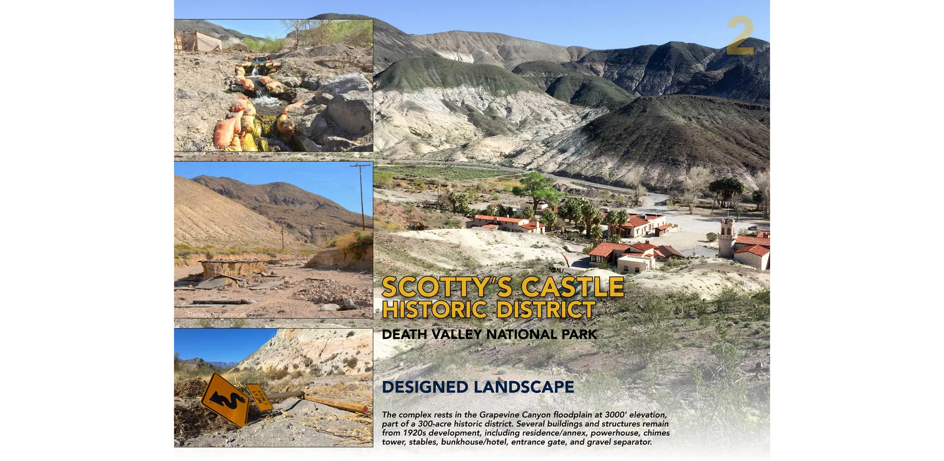 Case studies included field investigation and documentation of each site with regional and park staff, and gaining a better understanding of current impacts at work in contributing cultural landscape features. This further helped clarify opportunities for future studies of attribution of known impacts to climate change. Fieldwork, including visual inspection of landscape systems, topography, vegetation, buildings, structures, and other landscape features to assess and document condition and impacts, offered insights into park priorities, competing demands for staff expertise and funding, and the acknowledged gaps in available historical and projected climate data.