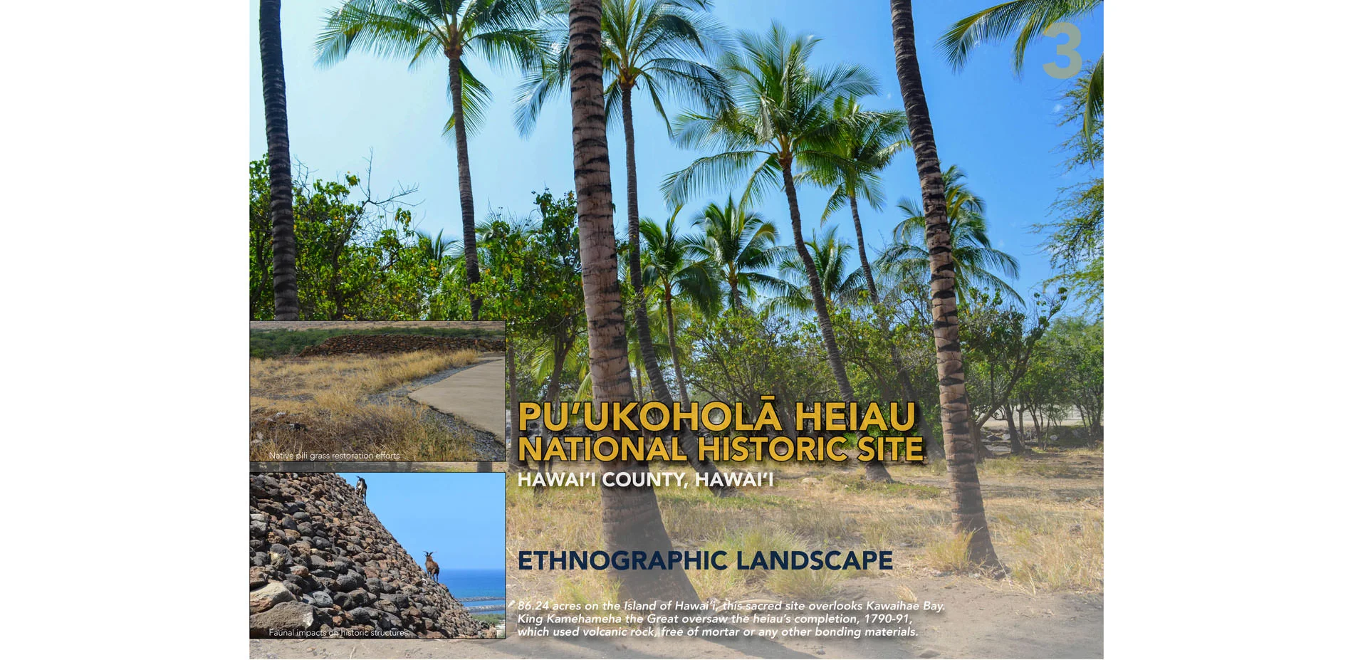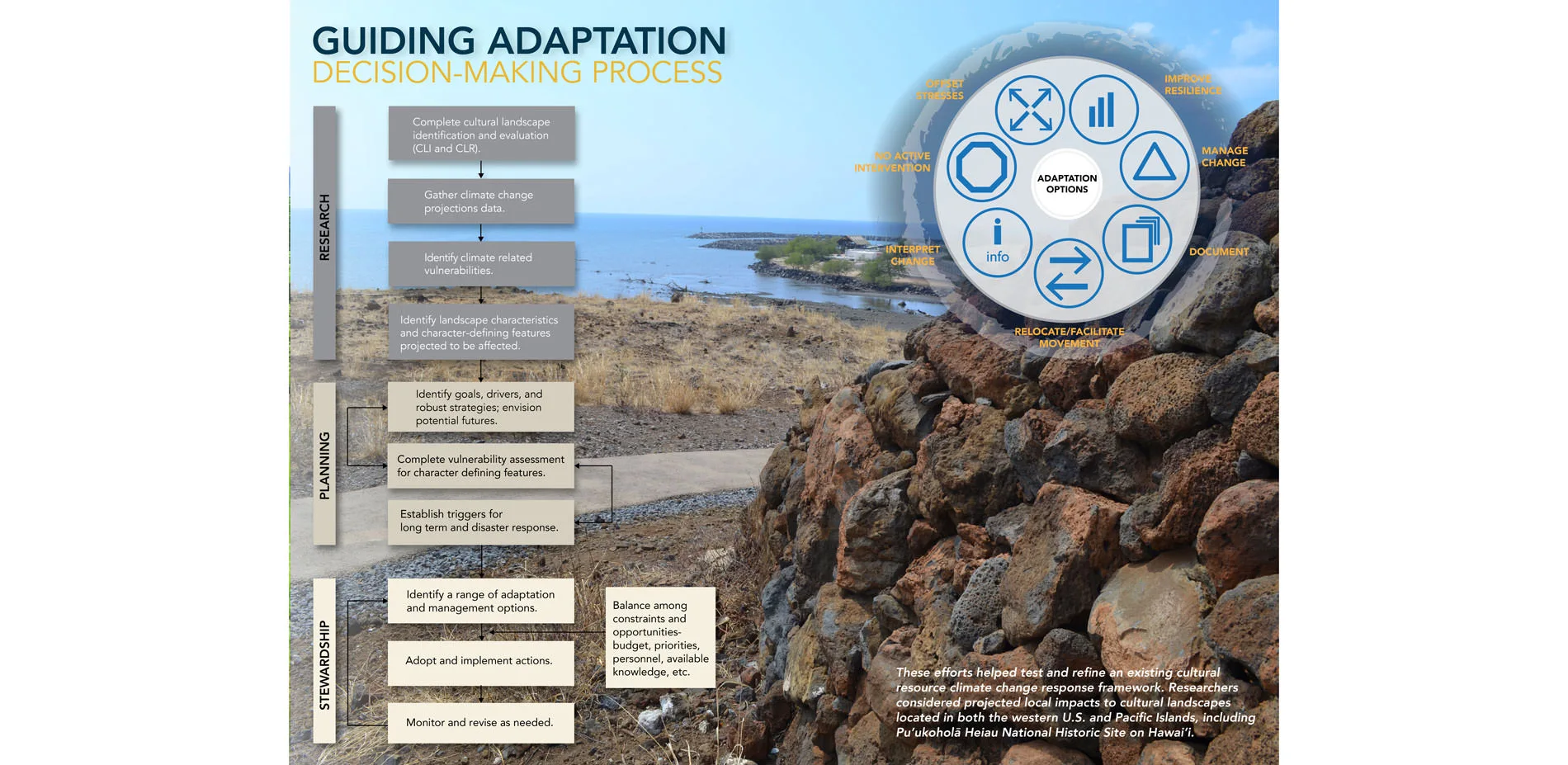 Partnering with NPS, the team refined the cultural resource climate change response framework, analyzing projected climate change impacts to cultural landscapes located in the western United States and Pacific Islands. Case studies identified current cultural landscape conditions, including how each condition could exacerbate potential effects of projected climate change.