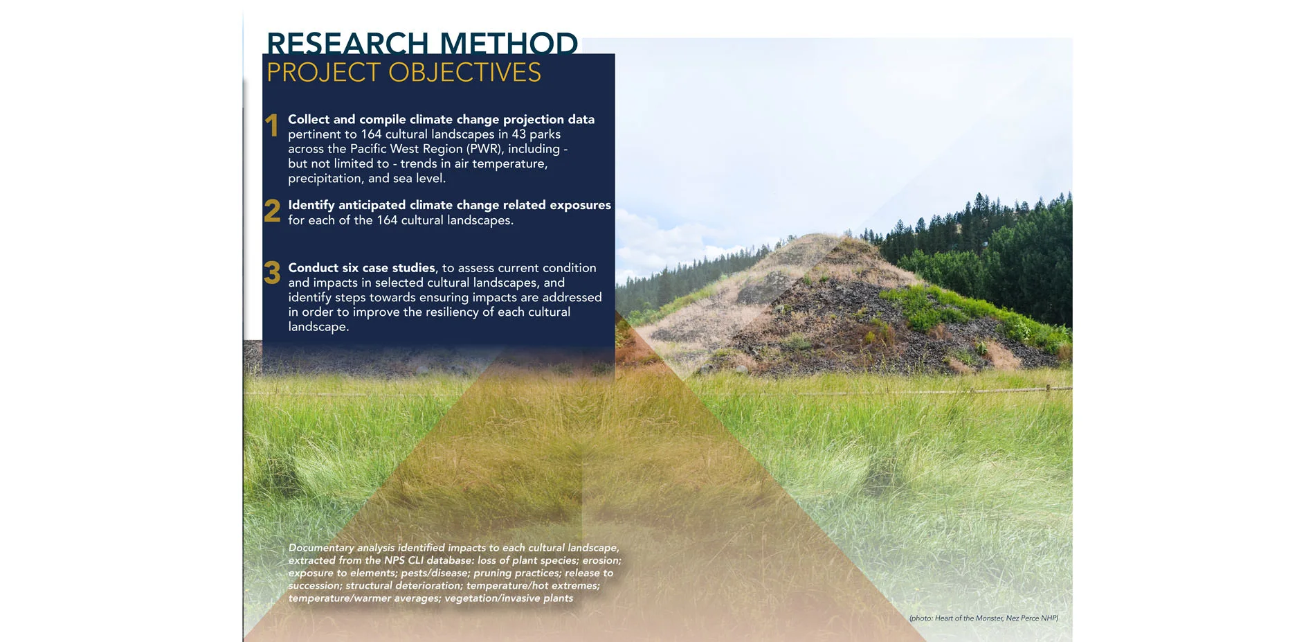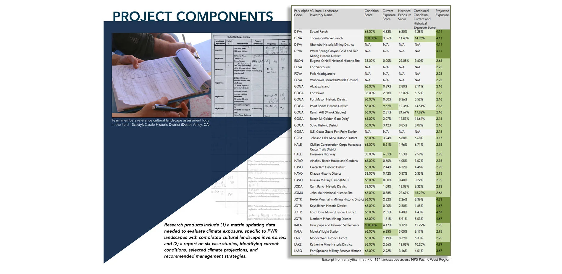 Products of this research include a matrix designed to update and organize data needed to evaluate the exposure of inventoried cultural landscapes in the Pacific West Region; and a report describing six case studies, which identifies current conditions, projected climate variables, and recommended management strategies to address current condition needs and areas of future research.