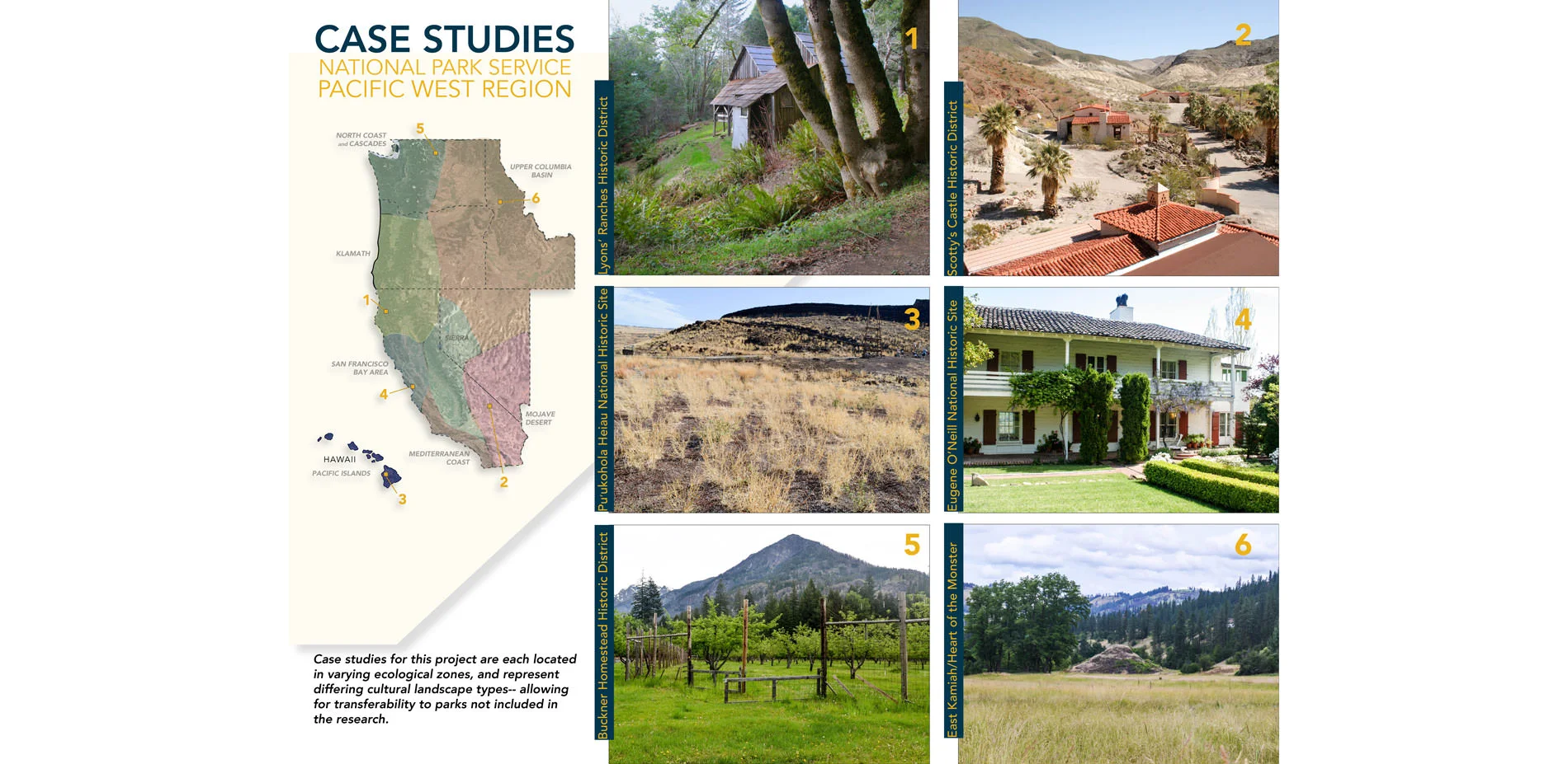 Case study sites: Lyons Ranches Historic District, Redwood National Park (CA); Scotty’s Castle Historic District, Death Valley National Park (CA); Eugene O’Neill National Historic Site (CA); Buckner Homestead, North Cascades National Park (WA); Pu’ukohola Heiau National Historic Site (HI); Heart of the Monster, Nez Perce National Historical Park (ID).