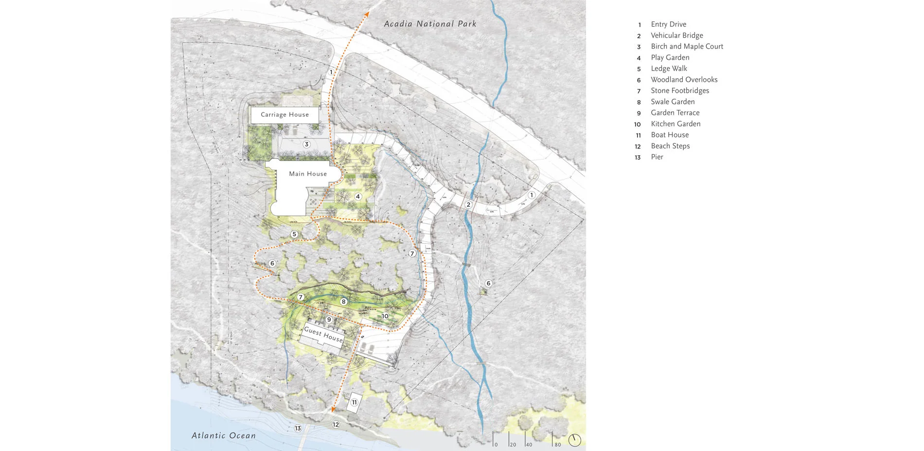 This five-acre site at the edge of Acadia National Park was once the summer home of Charles William Eliot, president of Harvard University and pioneer of the American landscape preservation movement in Maine. Prior to our involvement, the original estate had been demolished and large areas of the site were blasted for new construction. The project redefines the traditional understanding of landscape restoration, weaving site history with legible design form, structured as a journey down to the water. The design interventions are distinctly modern, but the materials palette and the plant communities remain familiar and indigenous. The result is an entirely restored, thriving, and hardy landscape created on a previously devastated site, created in honor of Eliot's primitive piece of coastal Maine.